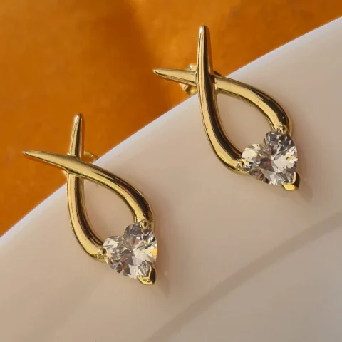 Gold Tone Brass Cross Arc Dual CZ Stud Earrings | Minimalist Diamond Look Curve Earrings for Women | Elegant Daily & Party Wear by Symoru