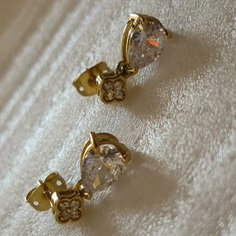 Gold Tone Brass Floral Stud with Pear Cut CZ Drop Earrings | Elegant Diamond Look Teardrop Earrings for Women | Party & Bridal Jewelry by Symoru
