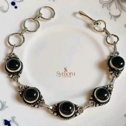 Symoru Brass Oxidized Black Stone Bracelet | Vintage Style Adjustable Handmade Bracelet | Boho Ethnic Jewelry for Women