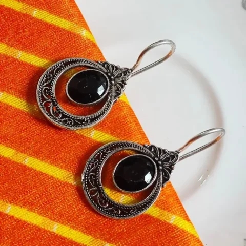 Black Stone Floral Brass Earrings | Oxidized Finish Statement Dangle Earrings for Women | Vintage Ethnic Jewelry | Gift for Her