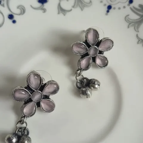 Oxidized Brass Multicolor Floral Earrings with Ghungroo Drops | Pink & Green Flower Stud Earrings | Handmade Boho Tribal Jewelry