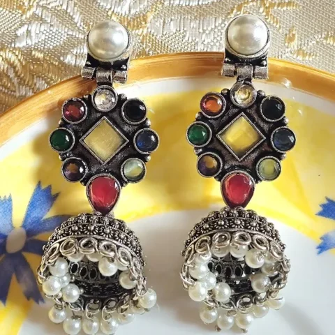 Oxidized Brass Multicolor Stone Jhumka Earrings with Pearls | Traditional Indian Statement Earrings for Women | Festive Ethnic Jewelry