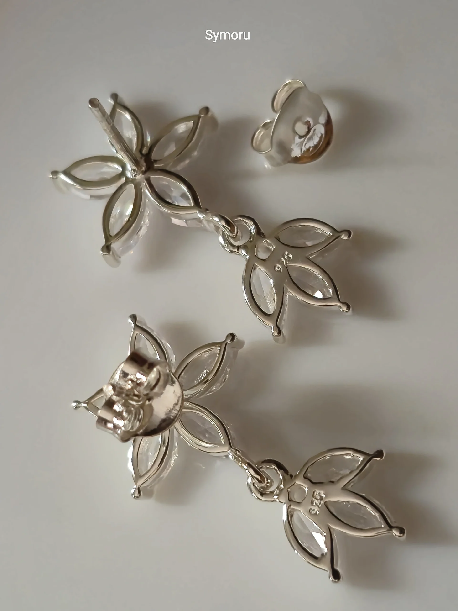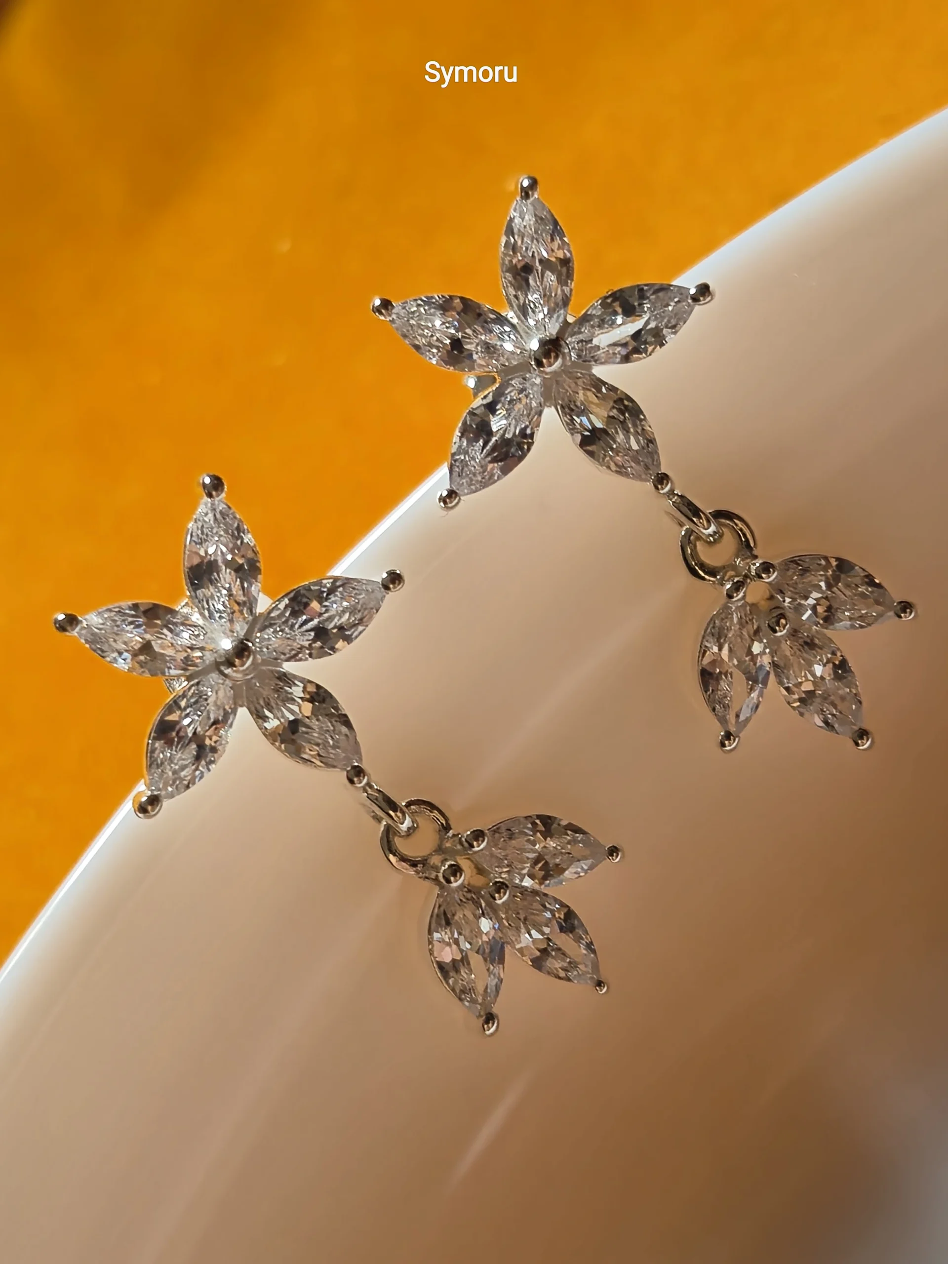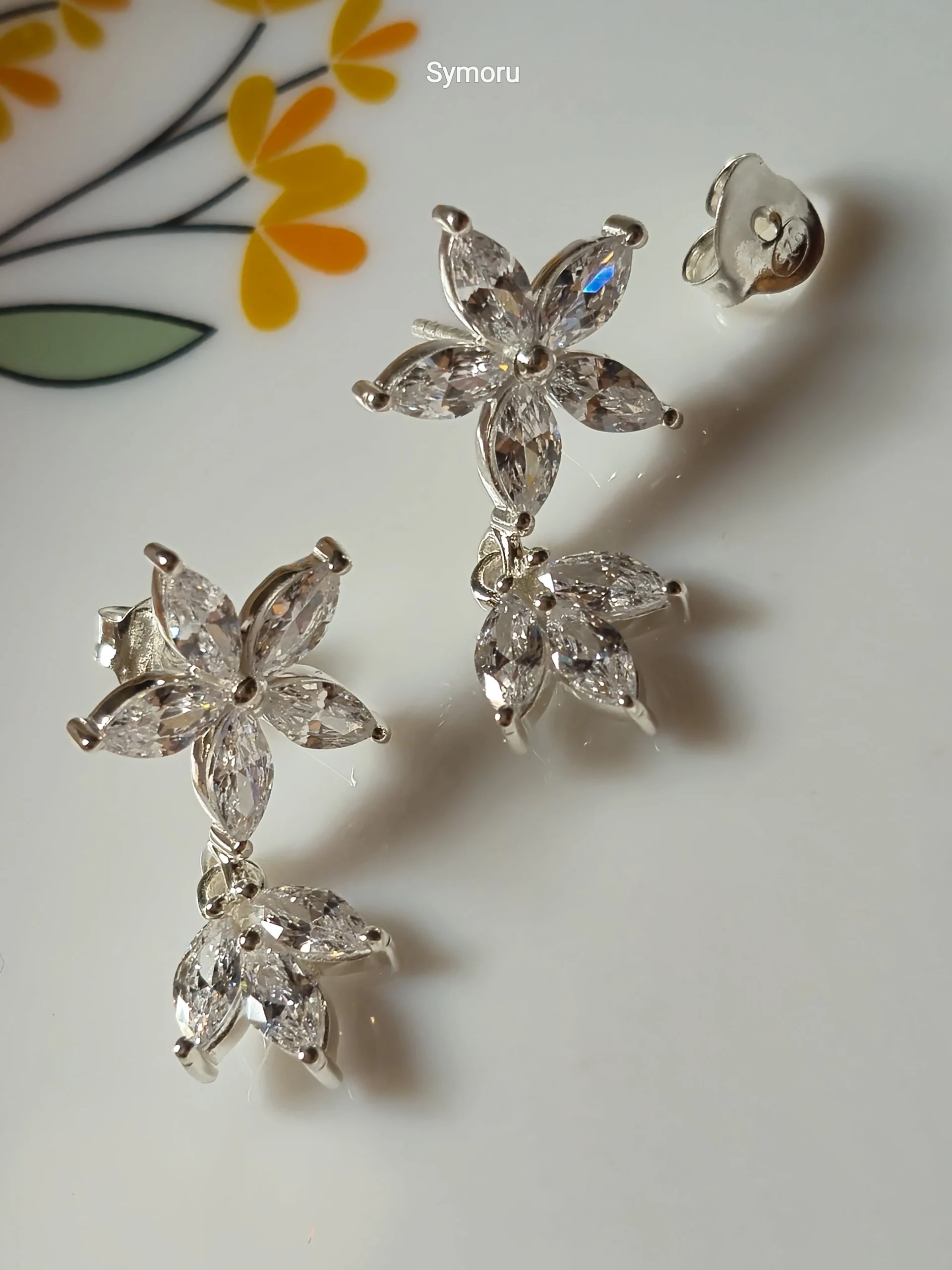 Add graceful sparkle to your look with these 925 Sterling Silver Floral Drop Earrings by Symoru. Designed with two delicately crafted flower motifs, each petal is set with shimmering marquise-cut cubic zirconia stones that create a luxurious diamond-like brilliance.