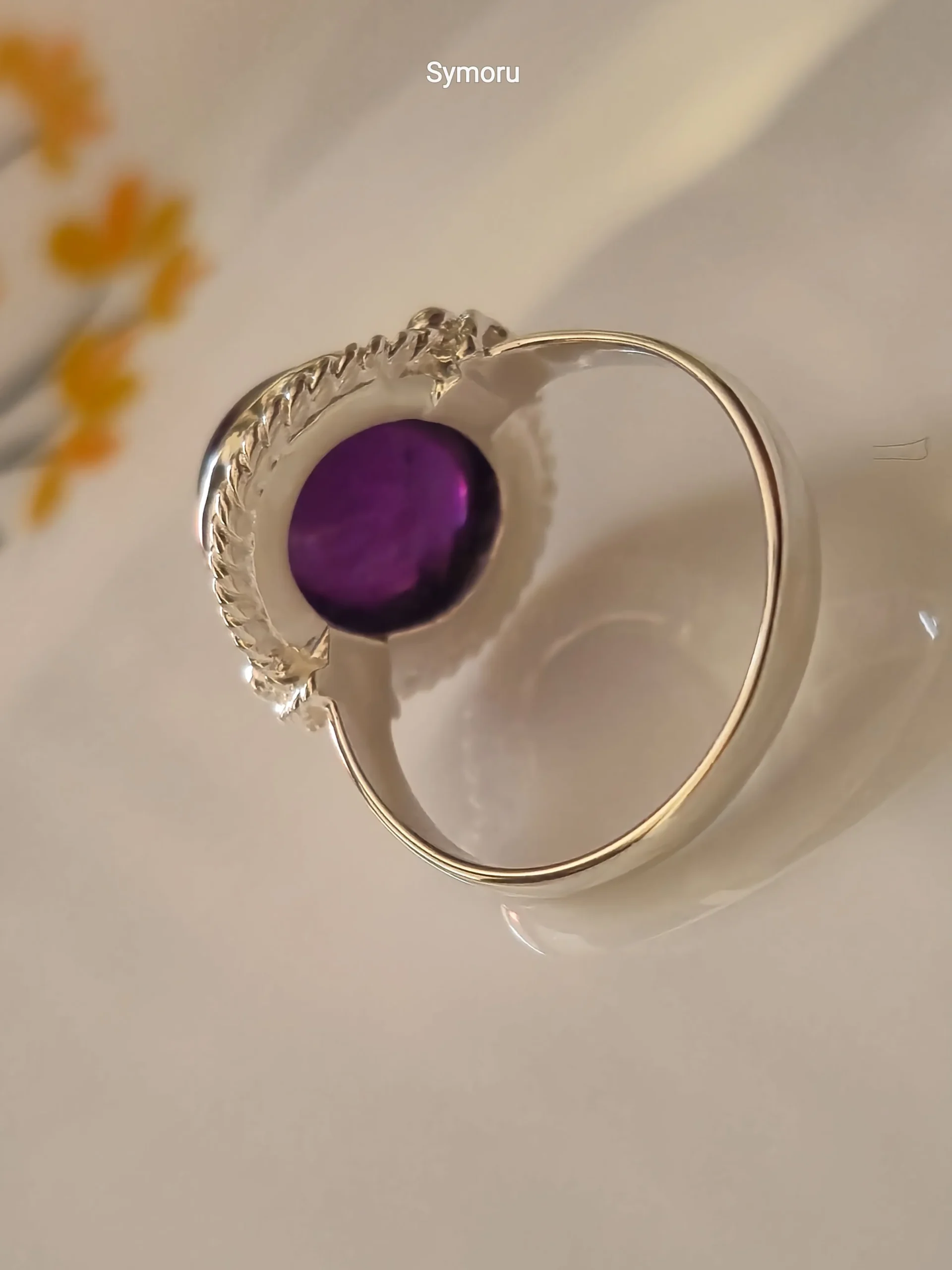 Elevate your jewelry collection with this stunning 925 Sterling Silver Amethyst Cabochon Ring, handcrafted with a beautiful round purple gemstone framed in an elegant rope-style bezel setting. The smooth, domed cabochon cut enhances the natural depth and glow of the amethyst, making it a timeless statement piece for everyday elegance or special occasions.