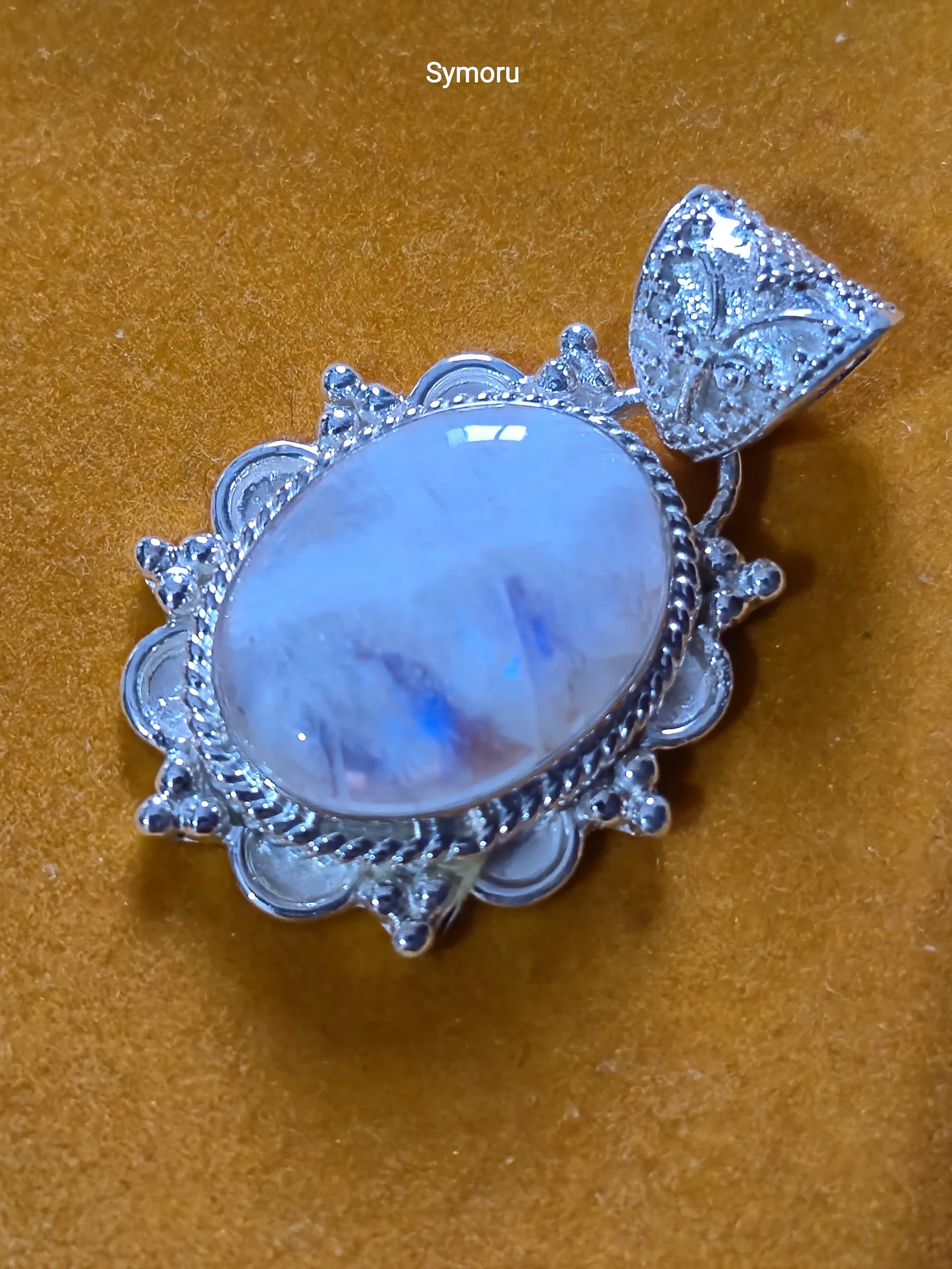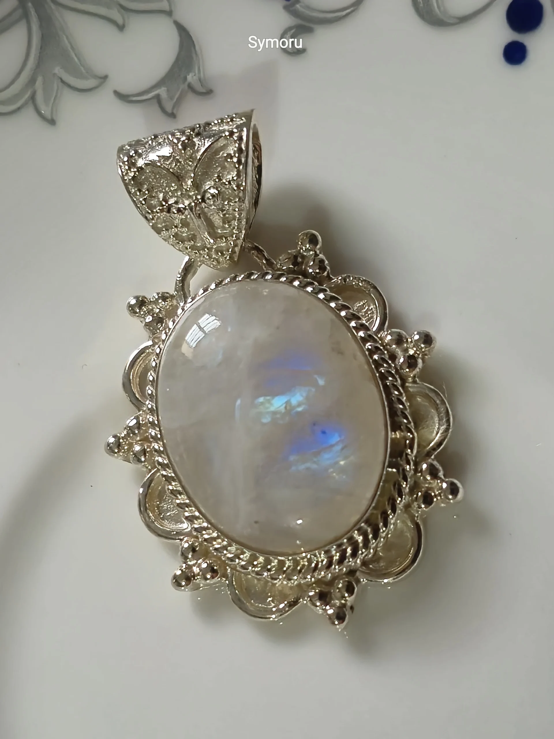 This **925 Sterling Silver Rainbow Moonstone Pendant by Symoru** features a luminous oval moonstone set in an intricately handcrafted floral frame. The natural blue flash of the moonstone creates a magical glow, symbolizing intuition, calmness, and feminine energy.