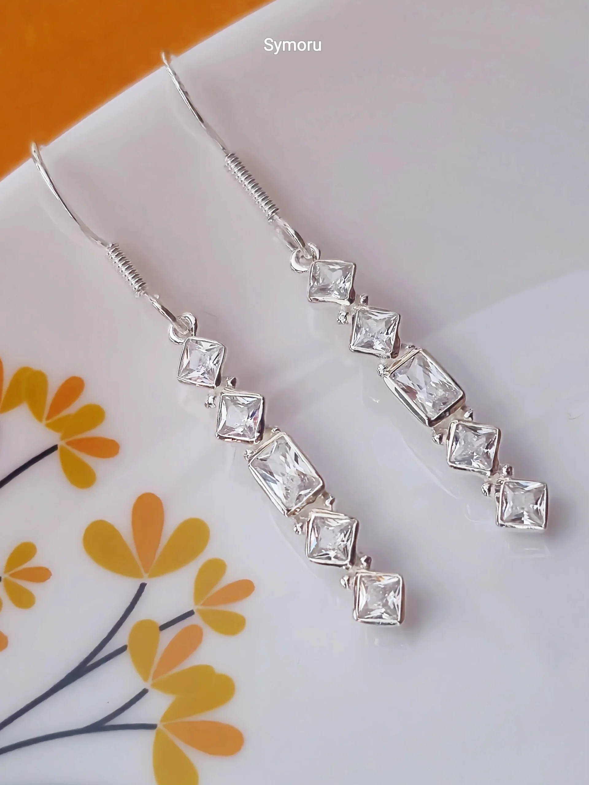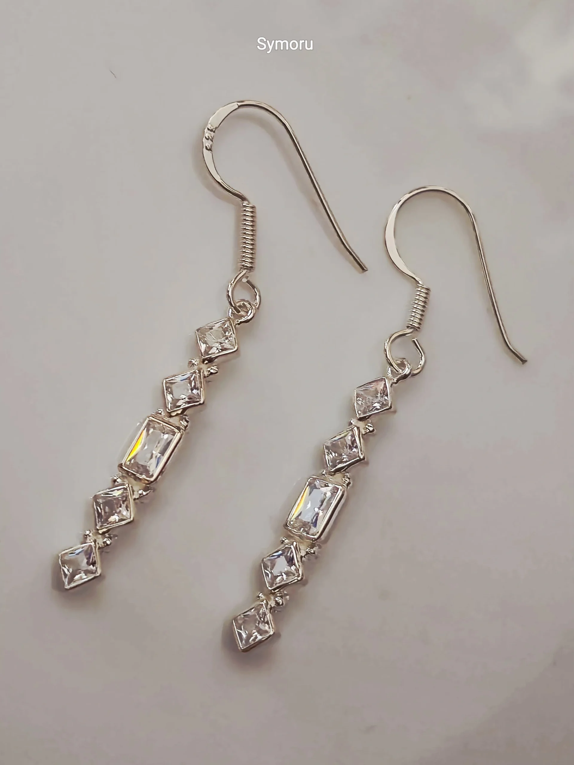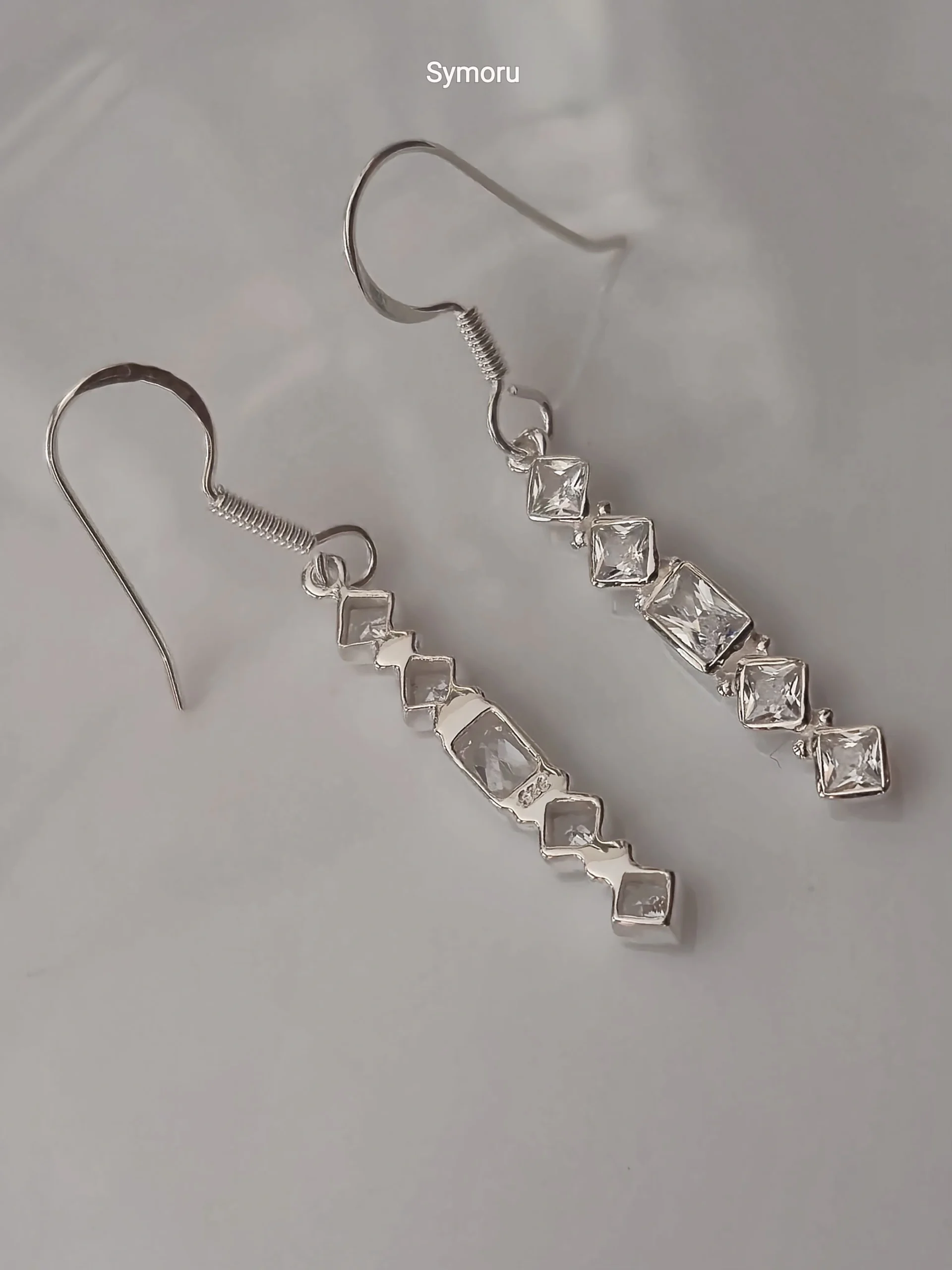 Elevate your everyday elegance with these 925 Sterling Silver Square CZ Drop Earrings by Symoru. Featuring a sleek vertical geometric design, each earring is adorned with multiple square-cut cubic zirconia stones that shimmer beautifully with every movement.
