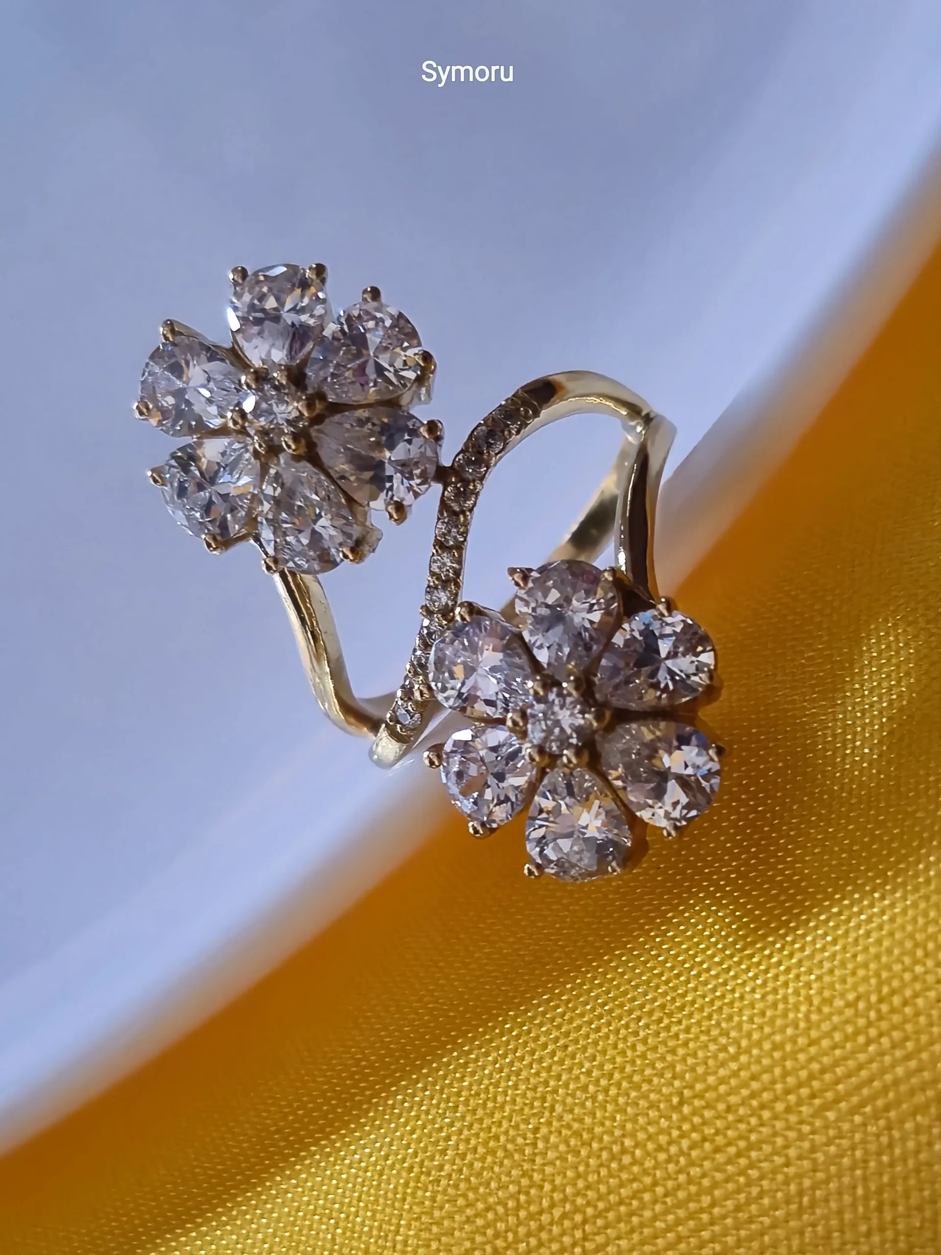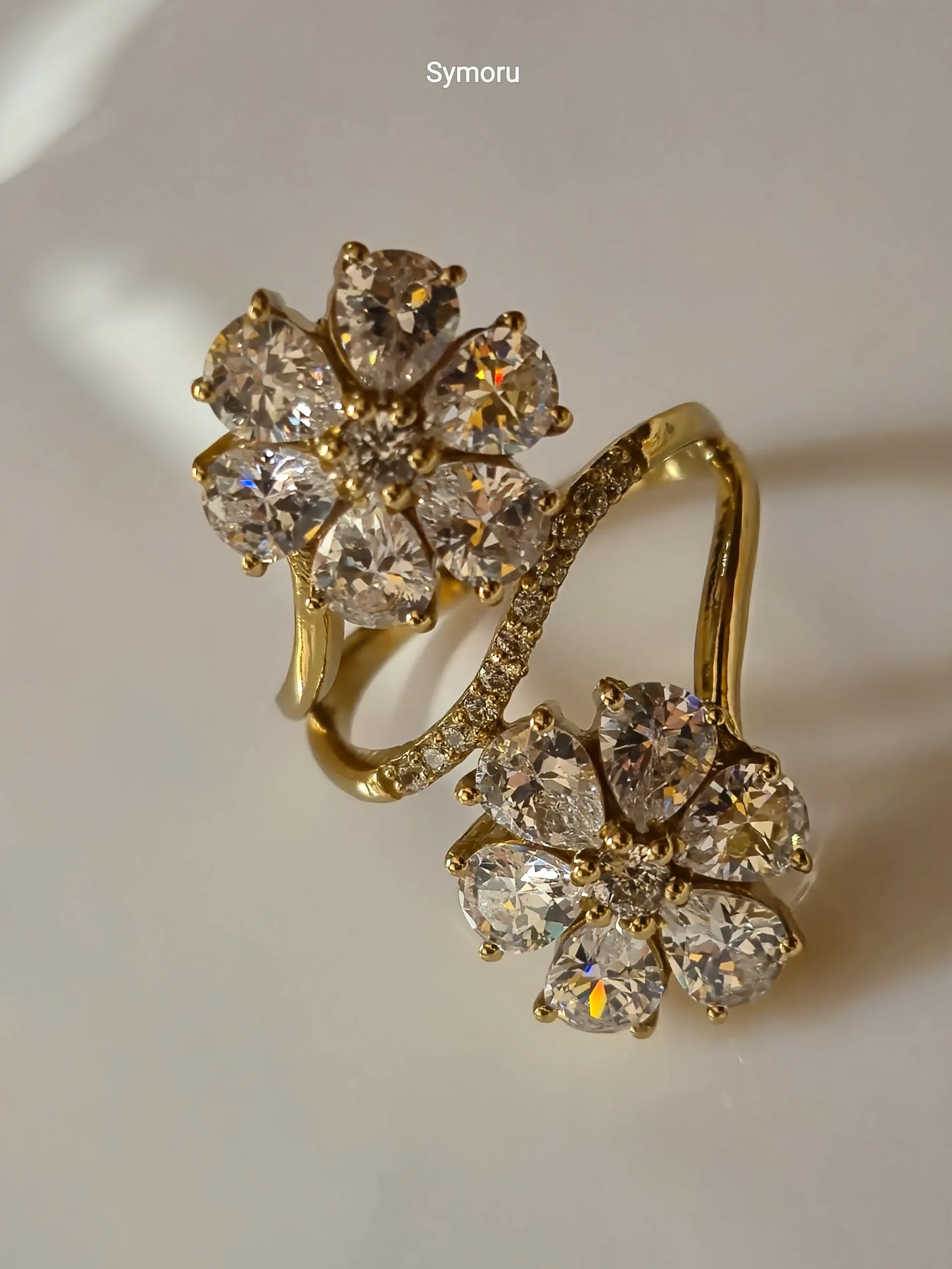 This elegant Symoru Dual Floral Cluster Ring features two dazzling flower-shaped clusters crafted from brilliant round-cut cubic zirconia stones, creating a stunning diamond-like sparkle. The open adjustable band is adorned with pave-set CZ stones, offering comfort, flexibility, and high-end designer appeal.