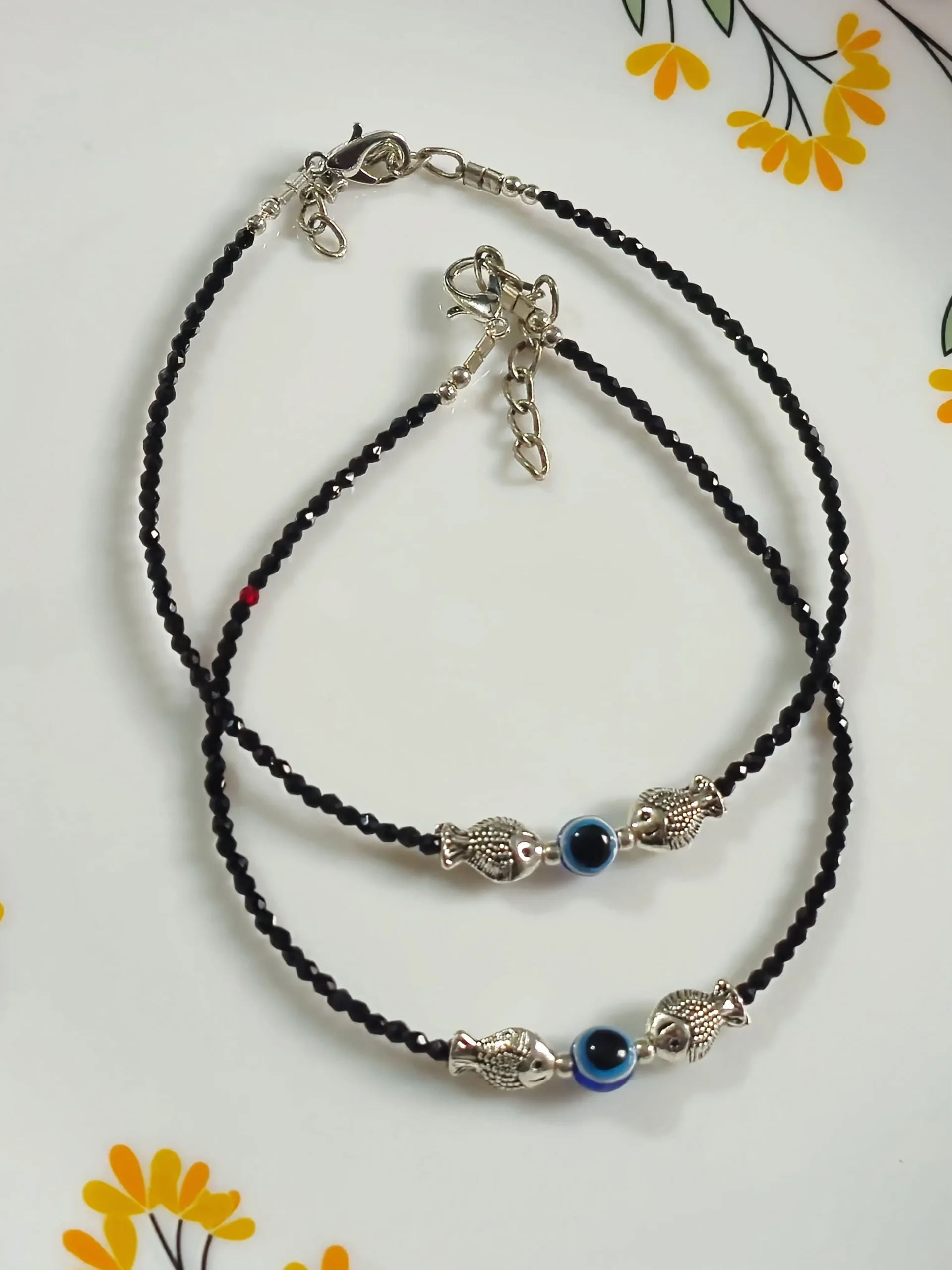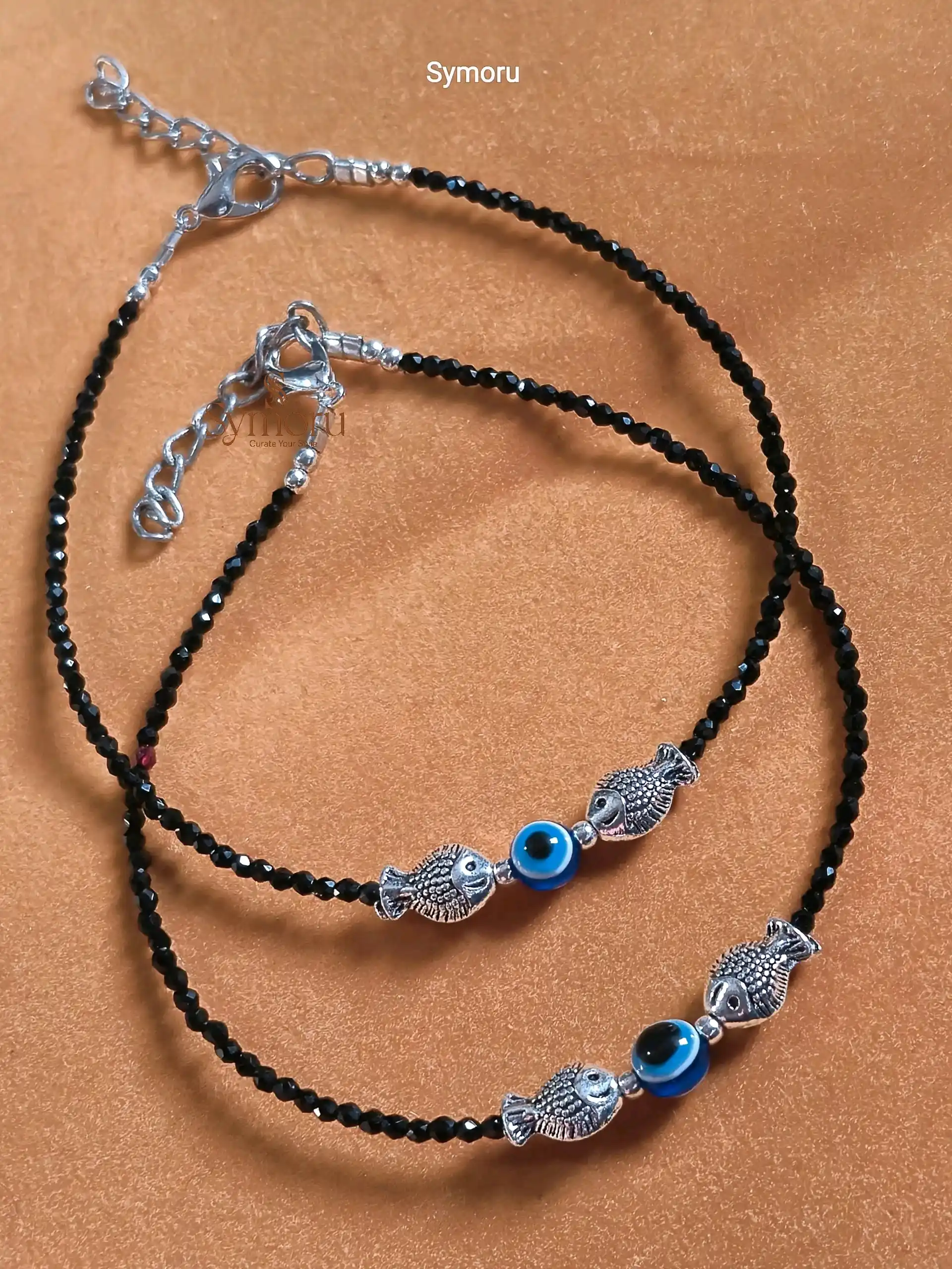 Oxidized Brass Black Beaded Evil Eye Fish Anklet