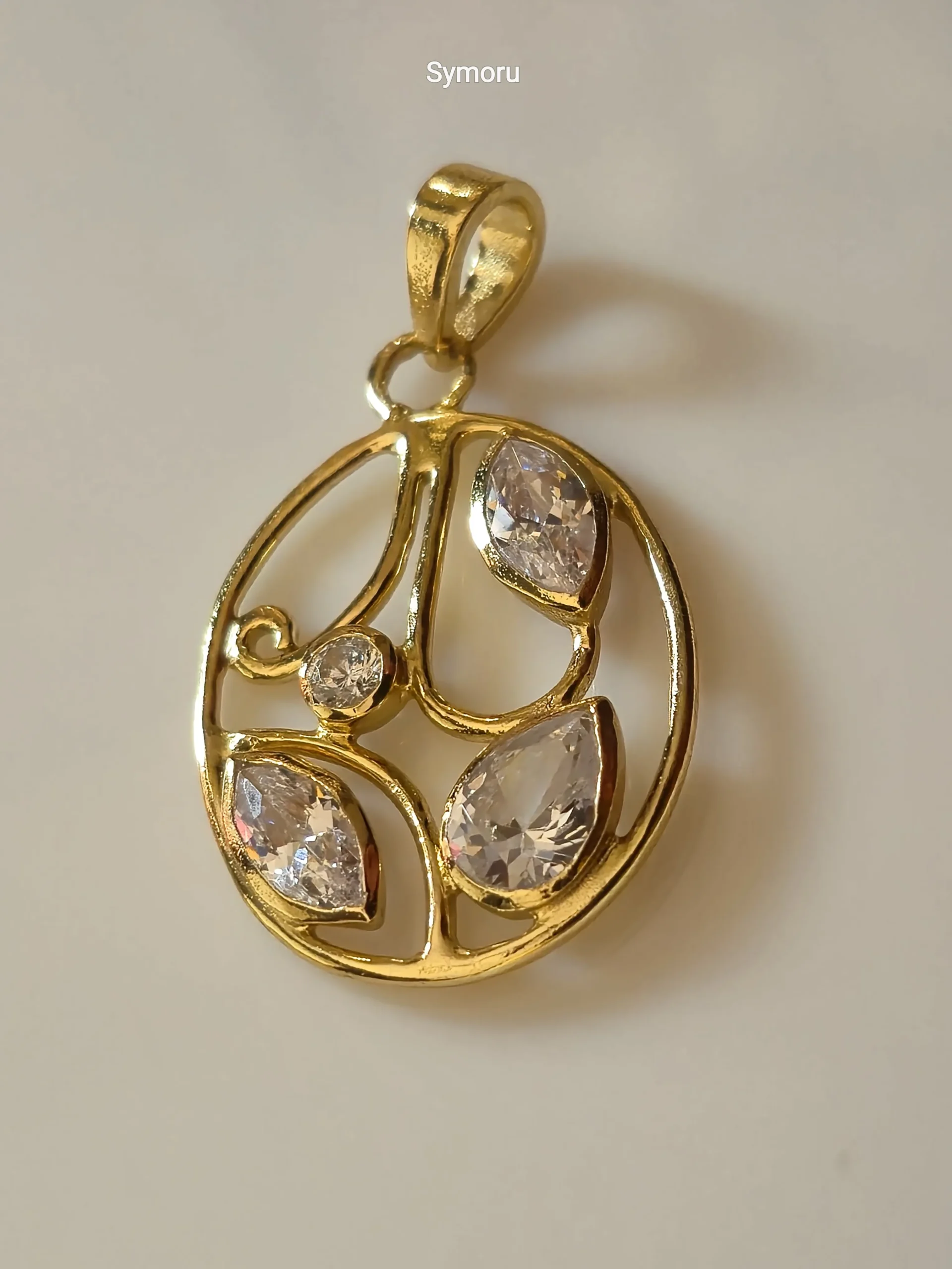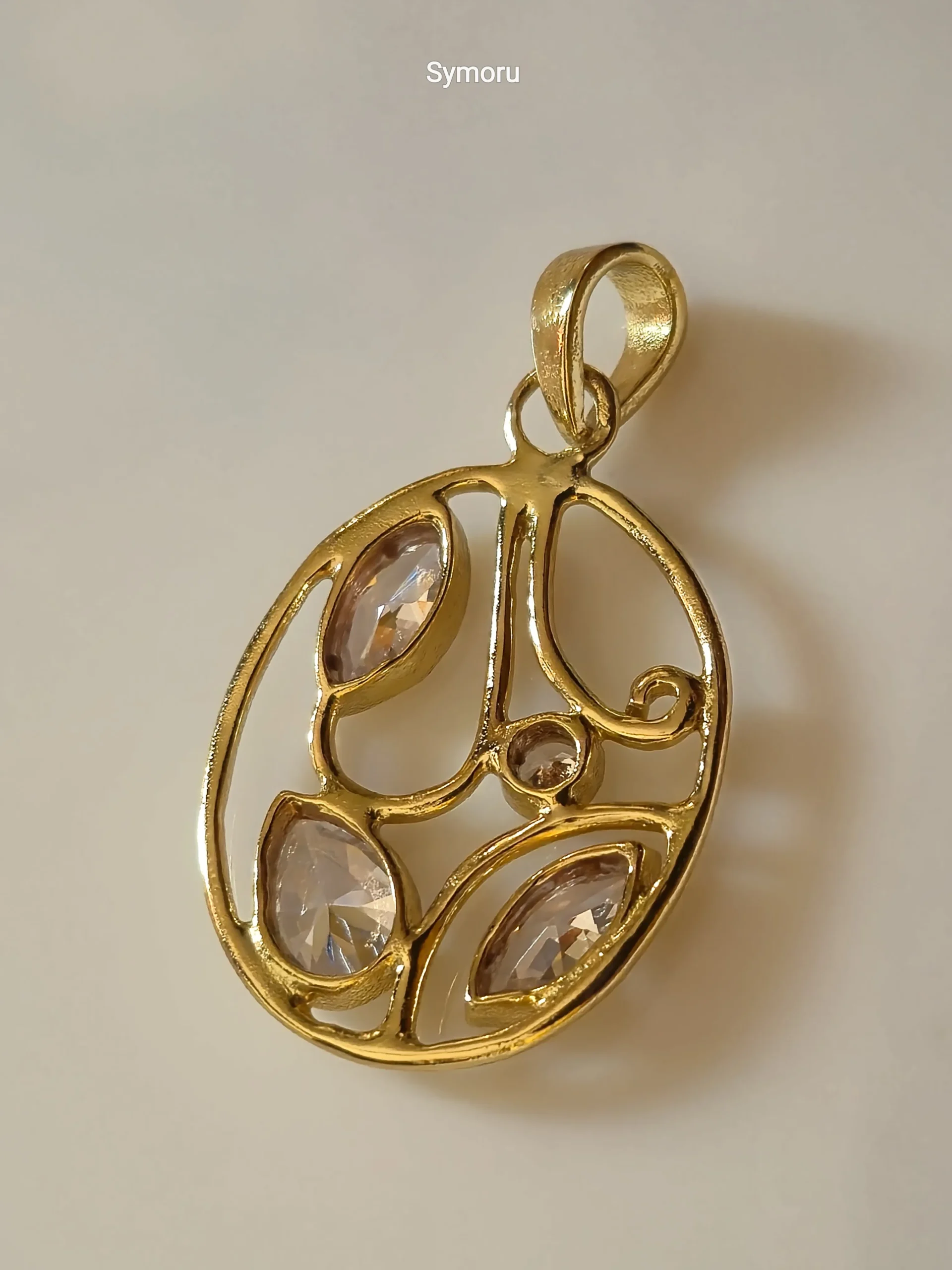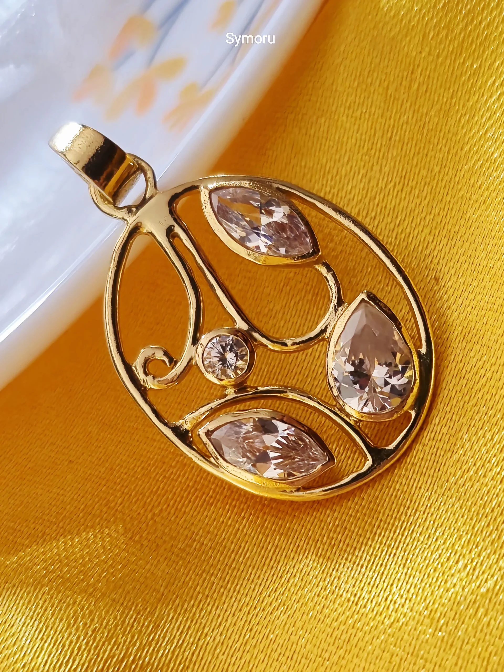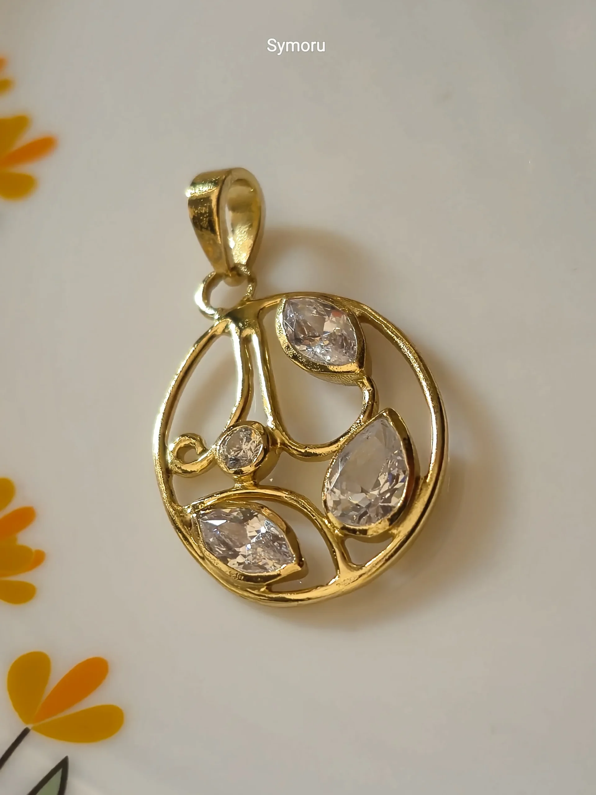 This graceful pendant from Symoru features a round open-frame design adorned with marquise-cut cubic zirconia leaves and a brilliant round center stone, forming a soft vine-inspired pattern. Crafted in original brass with a radiant gold finish, it reflects harmony, growth, and timeless beauty.
