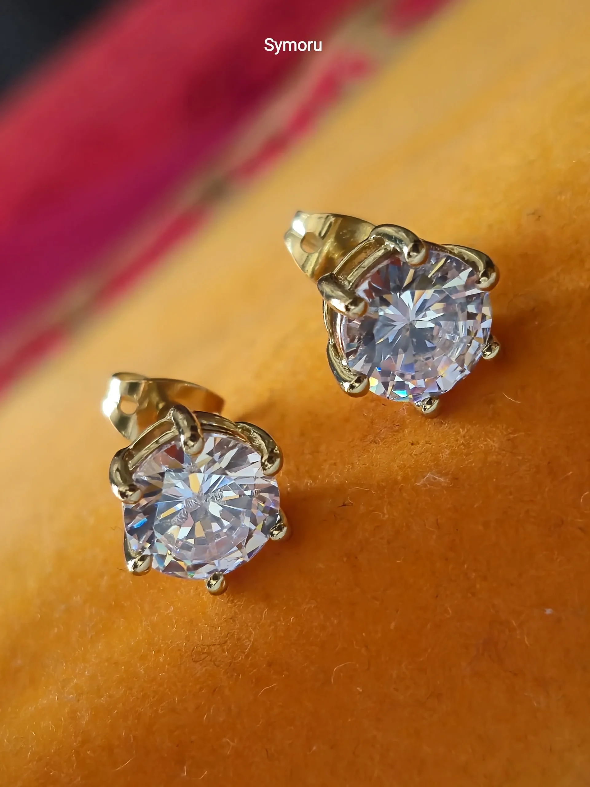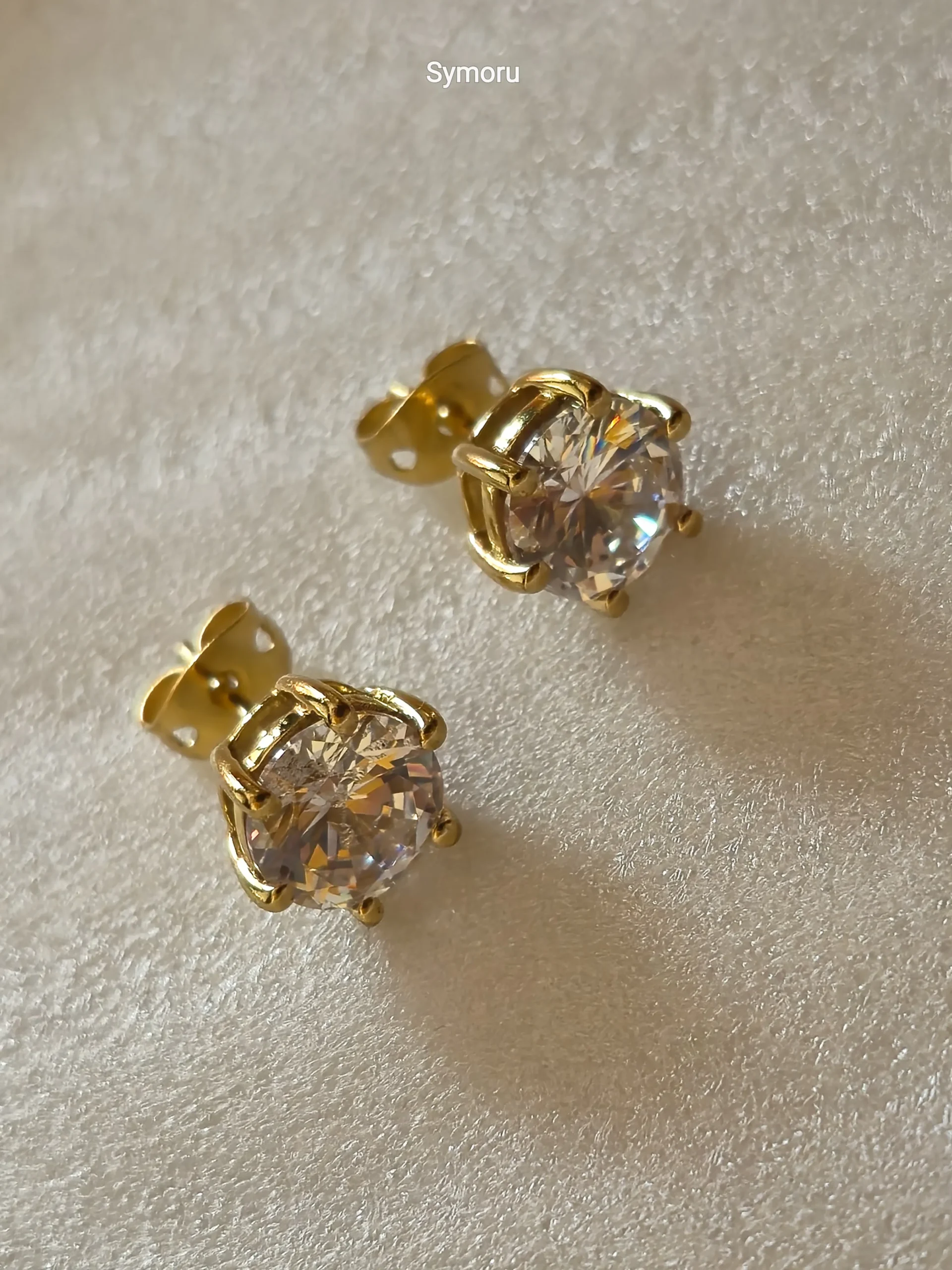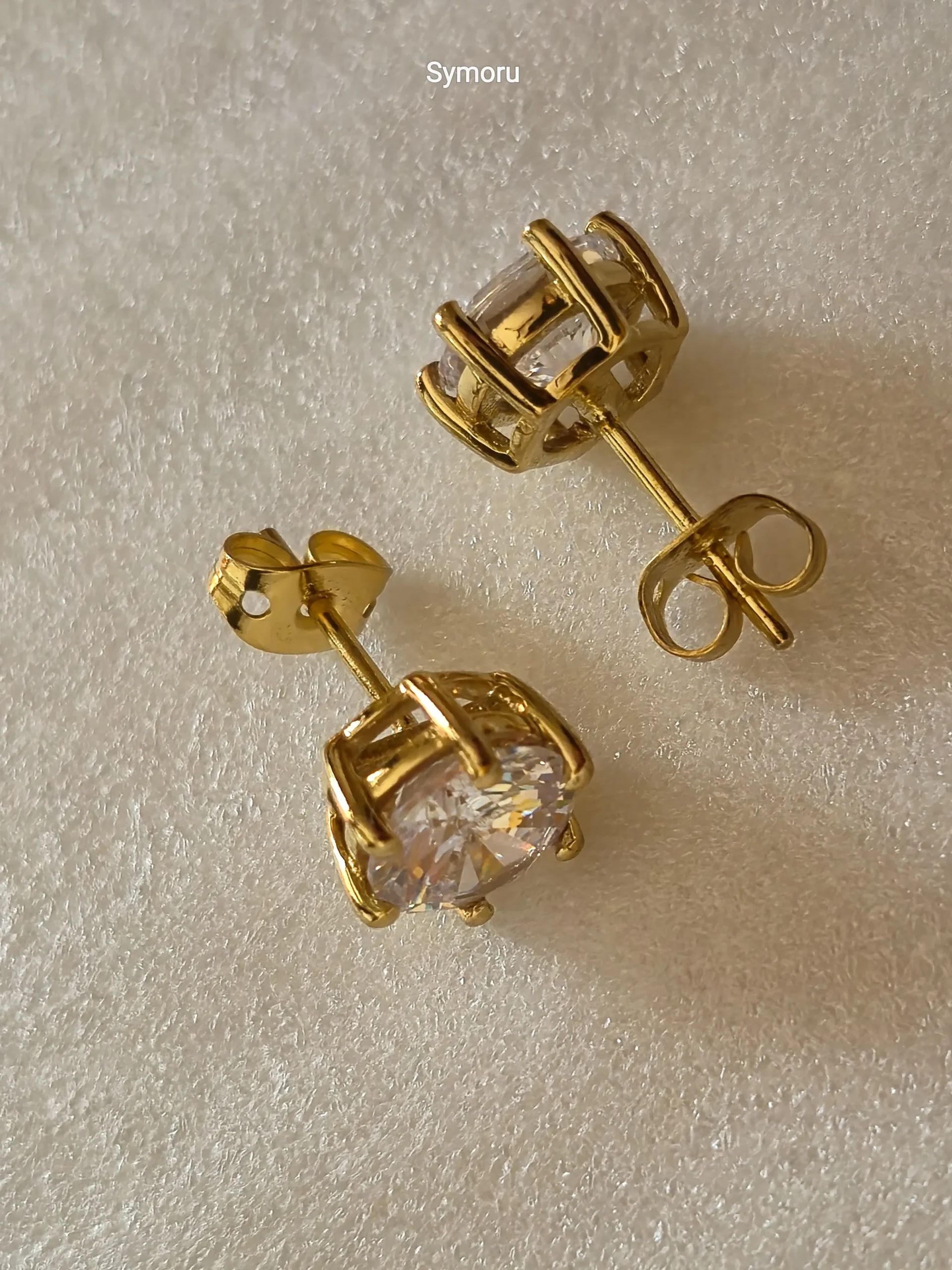 Gold Tone Brass Round Solitaire CZ Stud Earrings | Classic Diamond Look Studs for Women | Minimal Everyday & Party Wear by Symoru