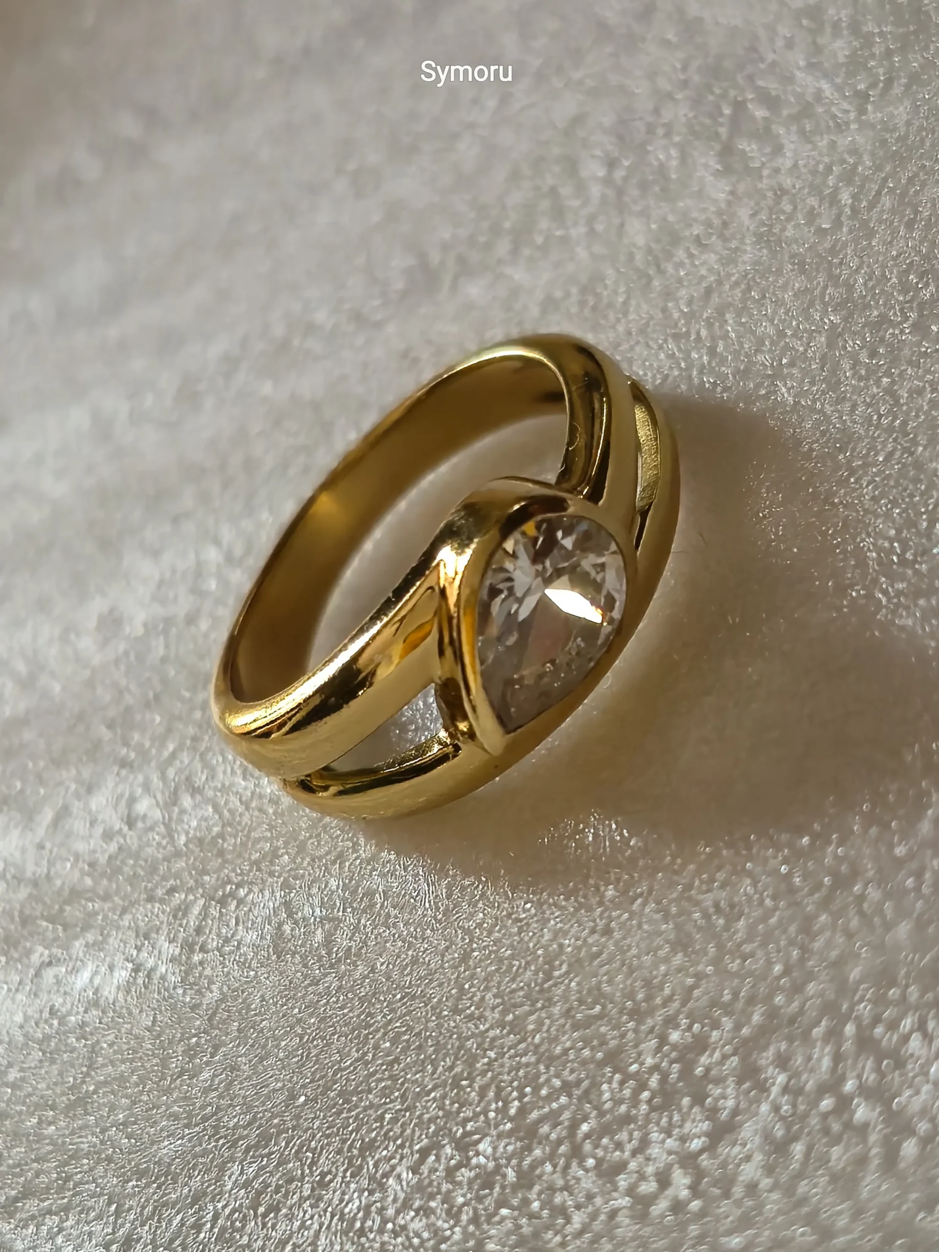 This Symoru Crystal Statement Ring features a radiant oval-cut clear stone set in a sleek gold bezel, beautifully supported by a sculpted open shank that wraps the finger with fluid curves. The design reflects light from every angle, creating a diamond-like sparkle that elevates any outfit instantly.
