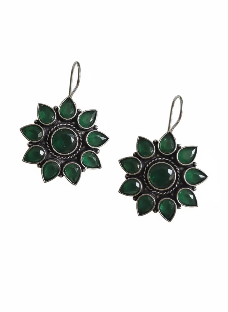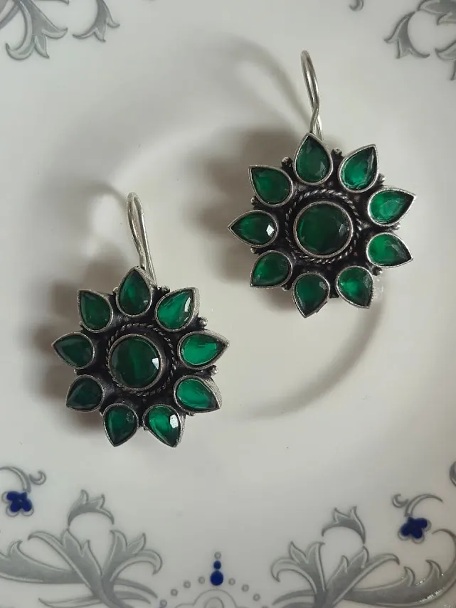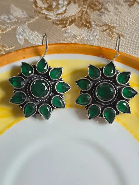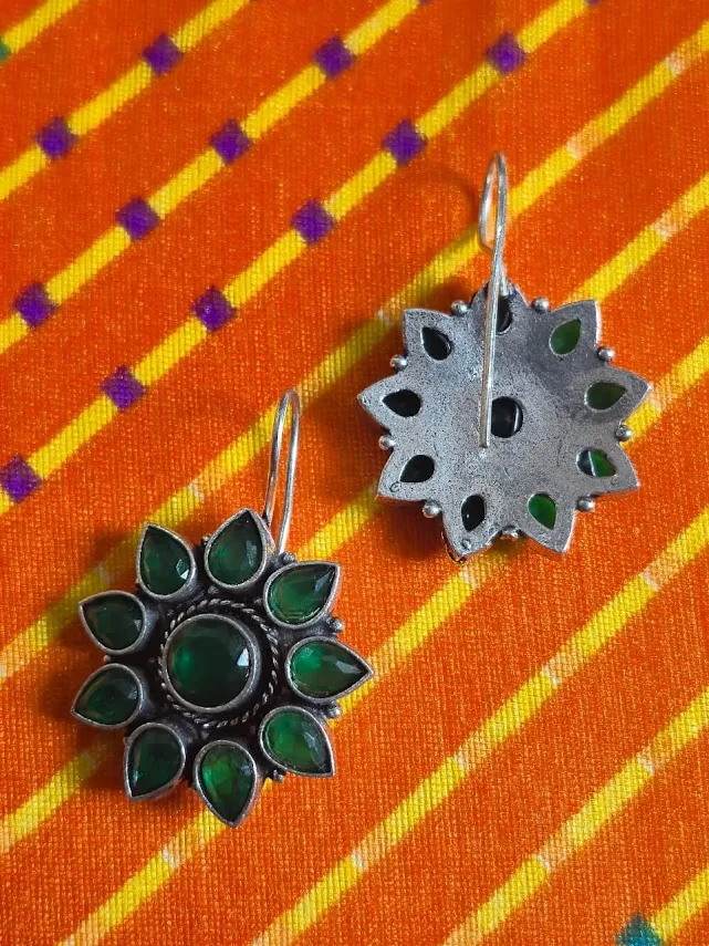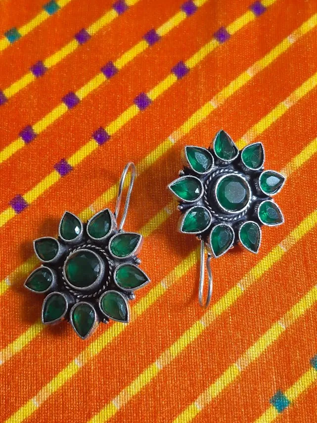 Add a touch of timeless elegance to your jewelry collection with these Handcrafted brass dangle earrings, featuring a stunning Floral sunburst design accented with Rich green stones. The oxidized silver-tone finish enhances the intricate detailing, giving these earrings a vintage and ethnic charm that pairs beautifully with both traditional and contemporary outfits.