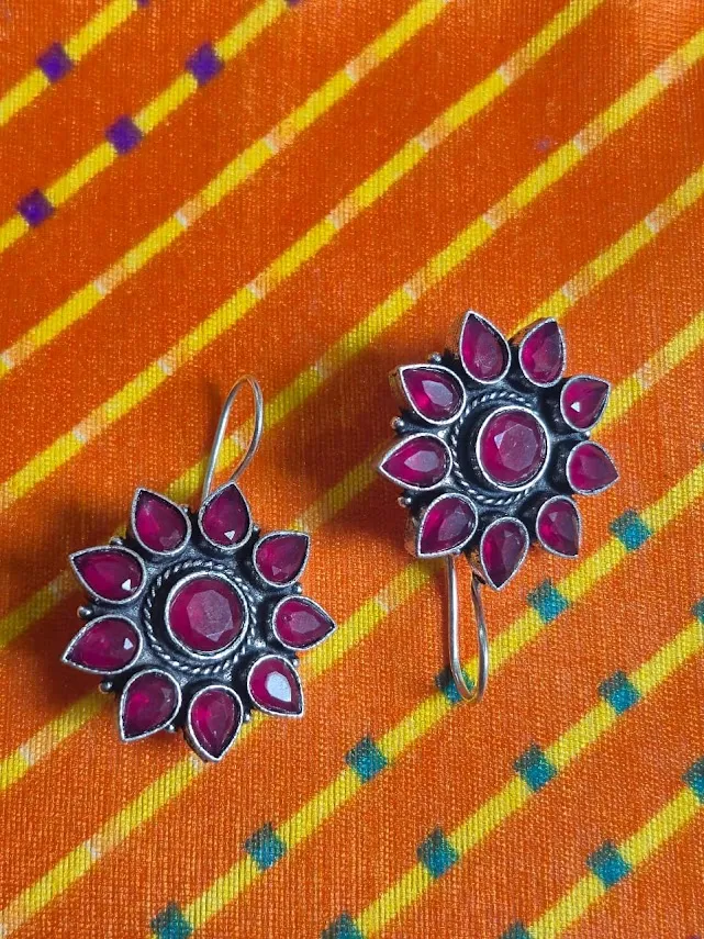 Add a bold ethnic charm to your jewelry collection with these Handcrafted oxidized brass floral earrings. Designed in a radiant flower motif, these earrings feature Deep ruby-red teardrop stones arranged beautifully around a central stone, creating a striking vintage look.