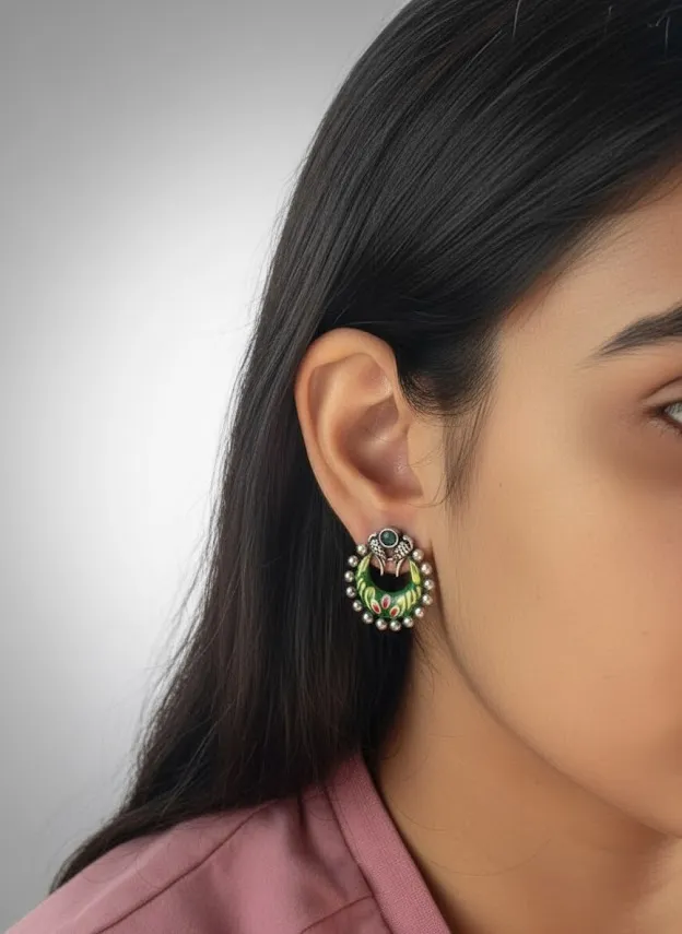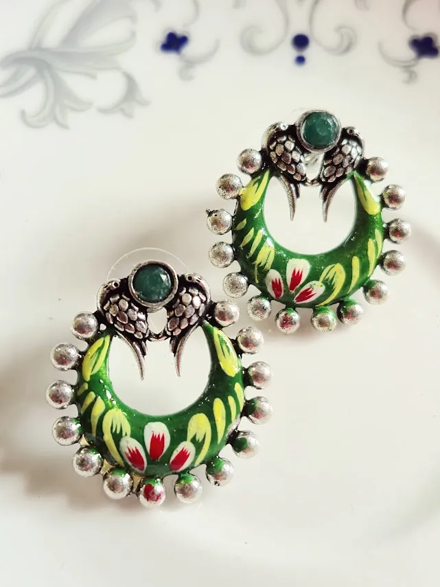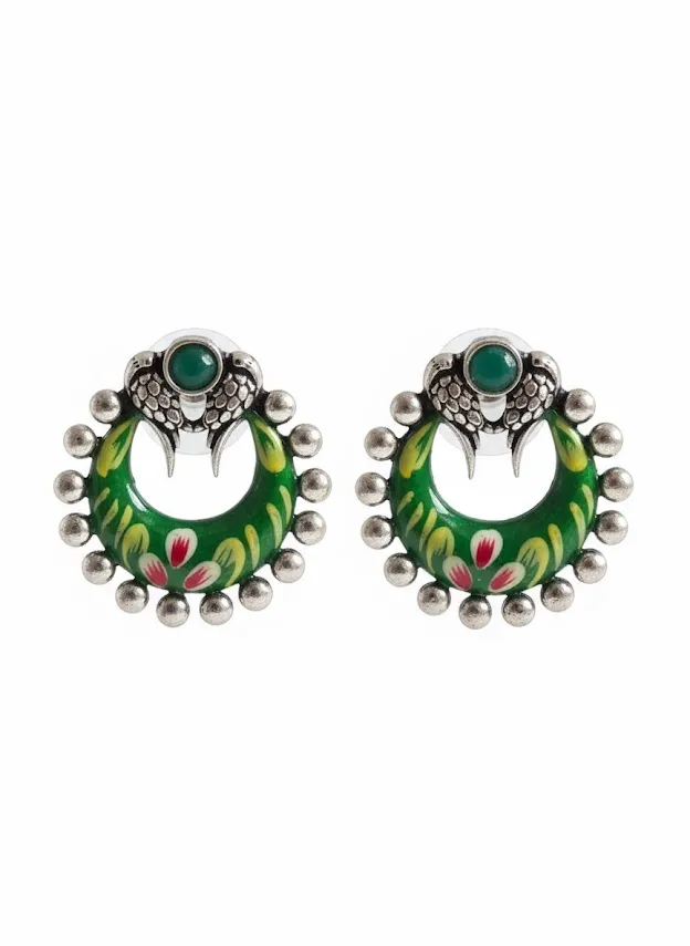 Make a bold style statement with these Handcrafted brass earrings, featuring a striking Green enamel crescent design accented with Handpainted floral motifs and finished in an Oxidized silver tone. The top stud is detailed with a tribal-inspired motif and a green stone look center, giving the earrings a unique ethnic character.
