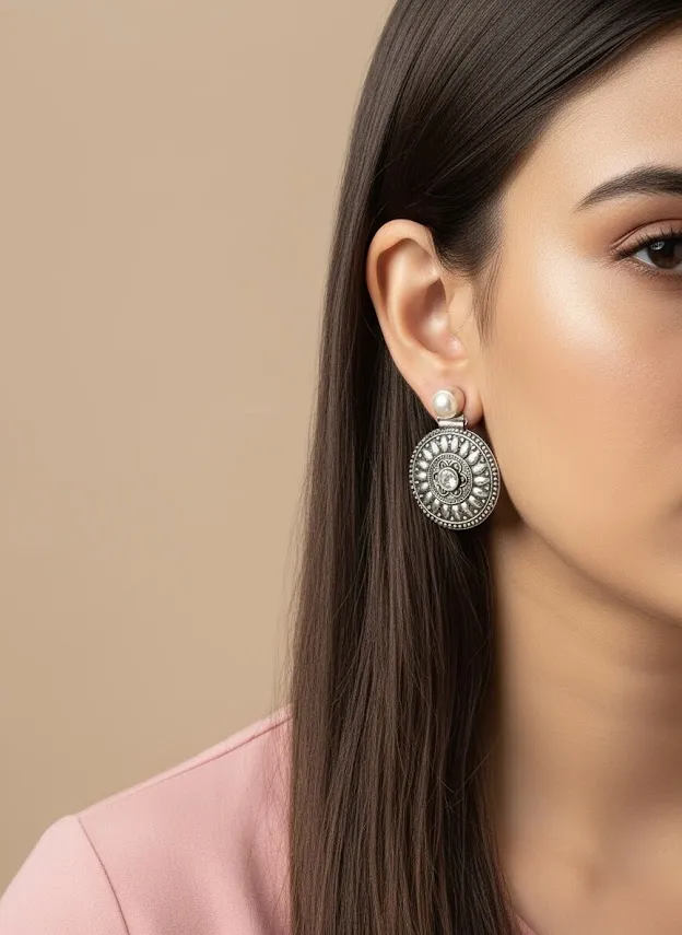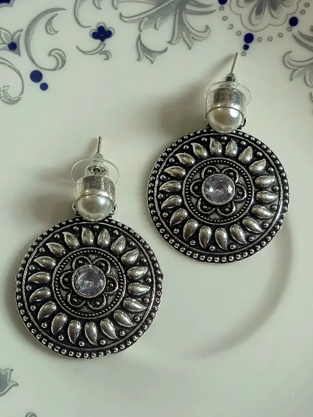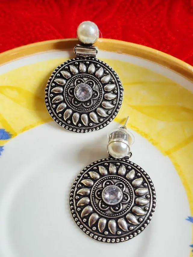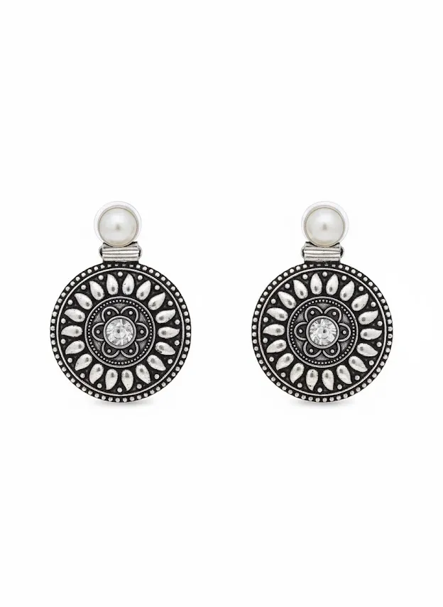 Add a timeless ethnic accent to your jewelry collection with these Handcrafted oxidized brass disc earrings. Featuring an intricate circular design inspired by Traditional tribal motifs, these earrings are accented with a White transparent stone centerpiece and a Classic pearl stud top for a perfect blend of elegance and heritage charm.