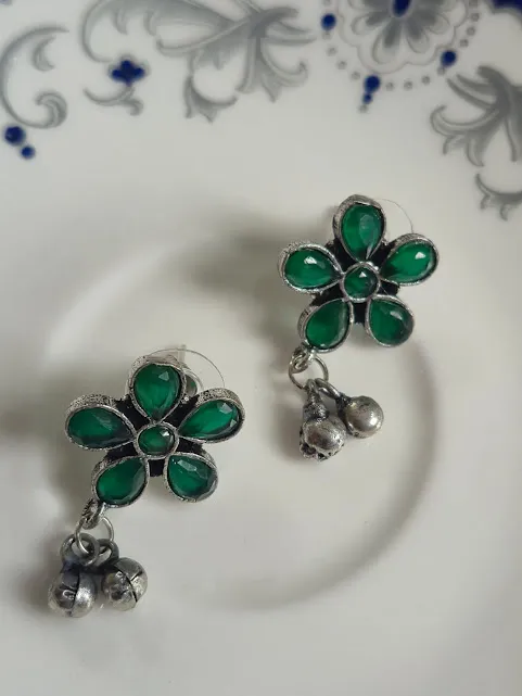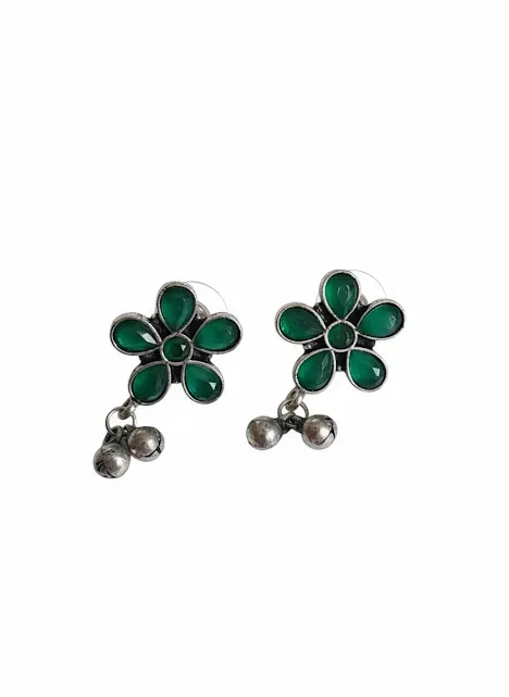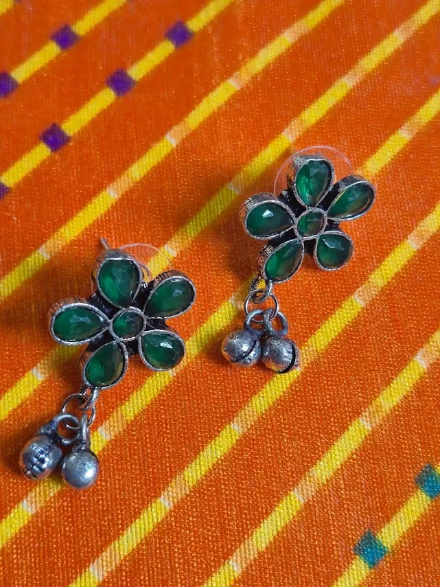✔ 1 × Oxidized Brass Green Flower Earrings with Ghungroo Drops