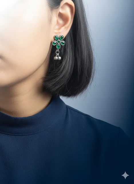 The deep green stones contrast gracefully with the oxidized silver-tone brass, making these earrings ideal for Festive wear, Indo-western outfits, office ethnic looks, or casual styling. Lightweight and comfortable, they offer all-day wearability while still standing out as a statement accessory.