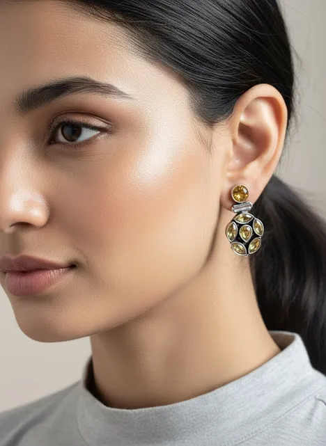 Enhance your look with these Handcrafted oxidized brass earrings, beautifully designed with a Dual-tone crystal stone combination. Featuring a Golden round stud top paired with a Green faceted stone cluster drop, these earrings offer a perfect blend of elegance and bold ethnic charm.