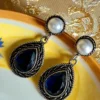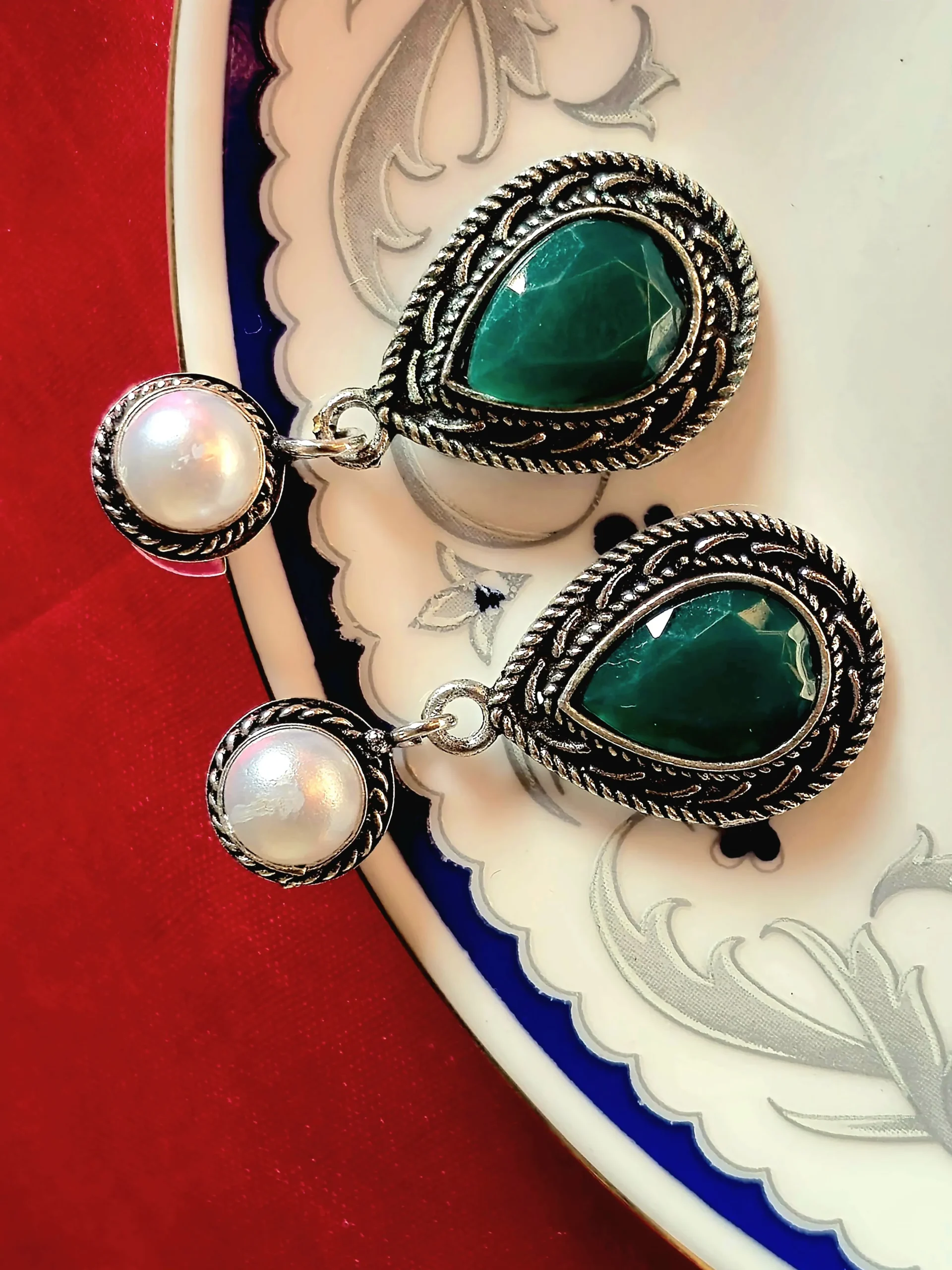 Add timeless elegance to your jewelry collection with these Handcrafted oxidized brass teardrop earrings, featuring a rich Deep green faceted glass stone beautifully framed in intricate vintage detailing. The earrings are finished with a Classic pearl-look stud, giving them a graceful and sophisticated appeal.