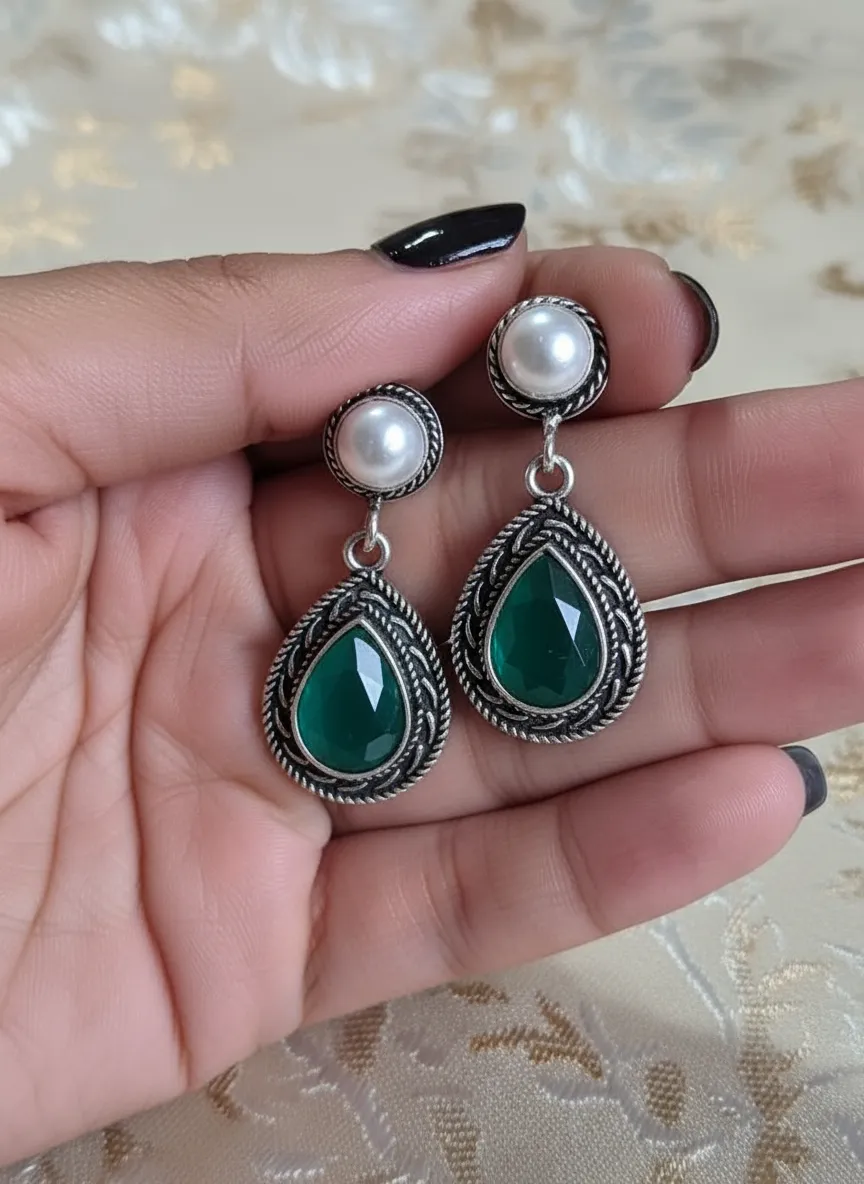 The antique oxidized silver finish enhances the depth of the green stone, making these earrings perfect for Festive wear, weddings, parties, and everyday ethnic styling. Lightweight and comfortable, they are designed for long wear without discomfort.