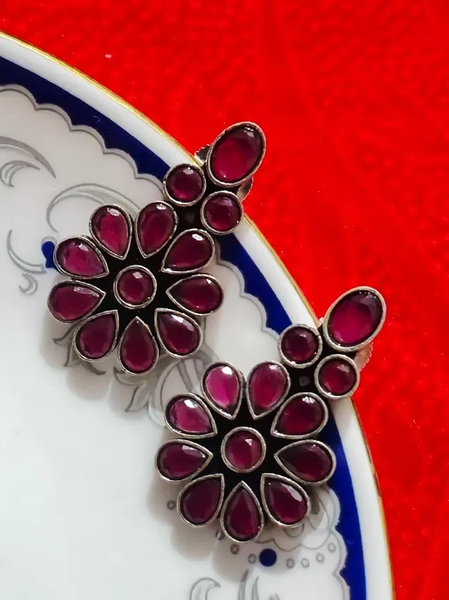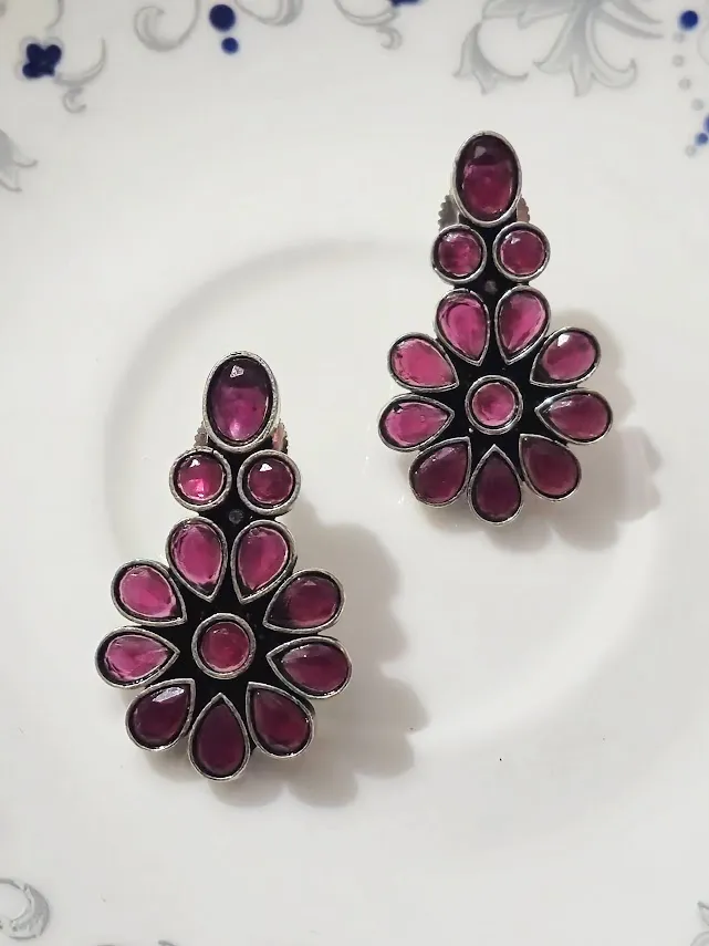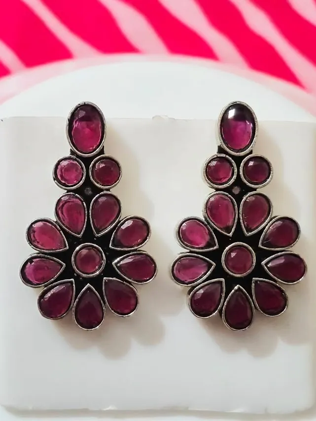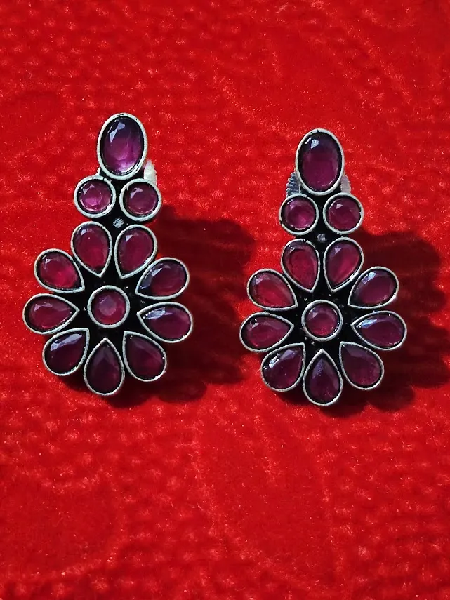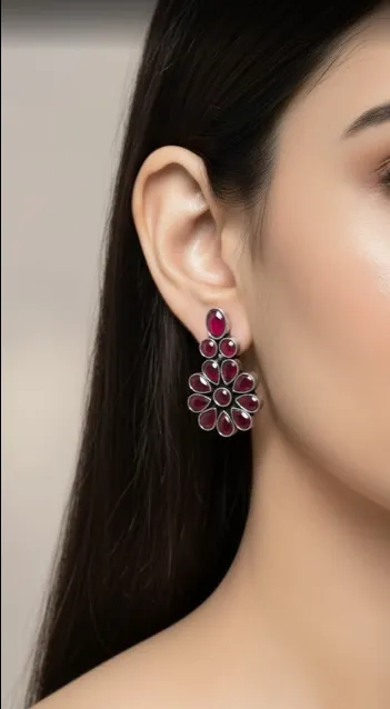 Make a bold and elegant statement with these Handcrafted oxidized brass drop earrings, featuring a striking Deep ruby-red glass stone floral design. The layered teardrop-shaped stones form a beautiful cascading floral pattern, enhanced by an antique oxidized silver finish.