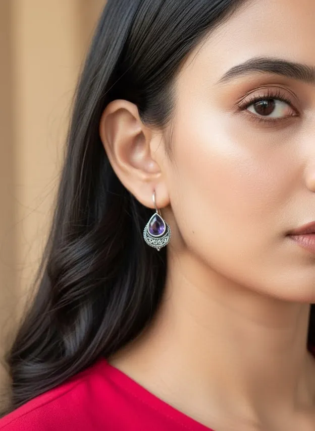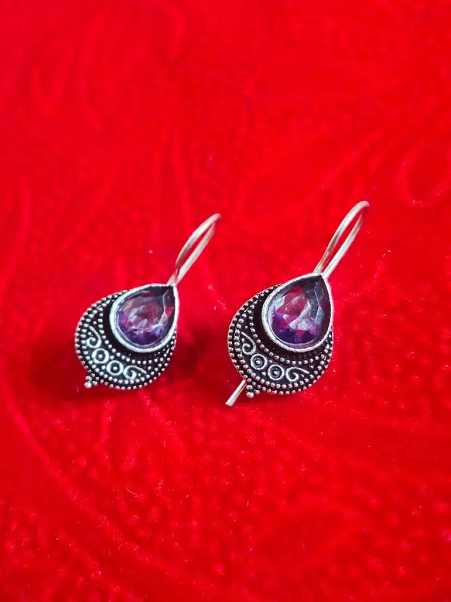 Oxidized Brass Teardrop Earrings with Purple Stone | Handmade Tribal Drop Earrings for Women | Boho Ethnic Jewelry Gift