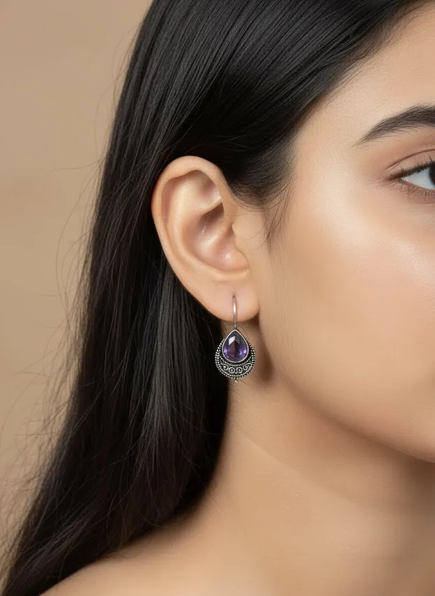 Enhance your ethnic and boho jewelry collection with these Oxidized Brass Teardrop Earrings from Symoru. Beautifully handcrafted, these earrings feature a Purple Stone set in an intricately detailed oxidized brass frame, inspired by Tribal and traditional Indian jewelry designs.