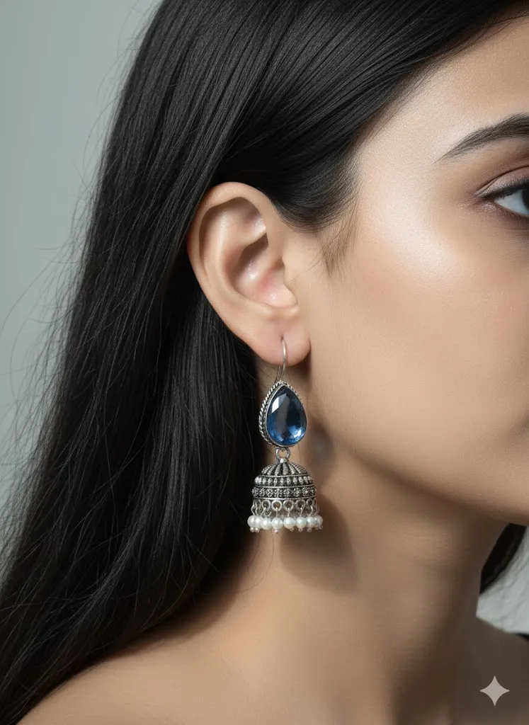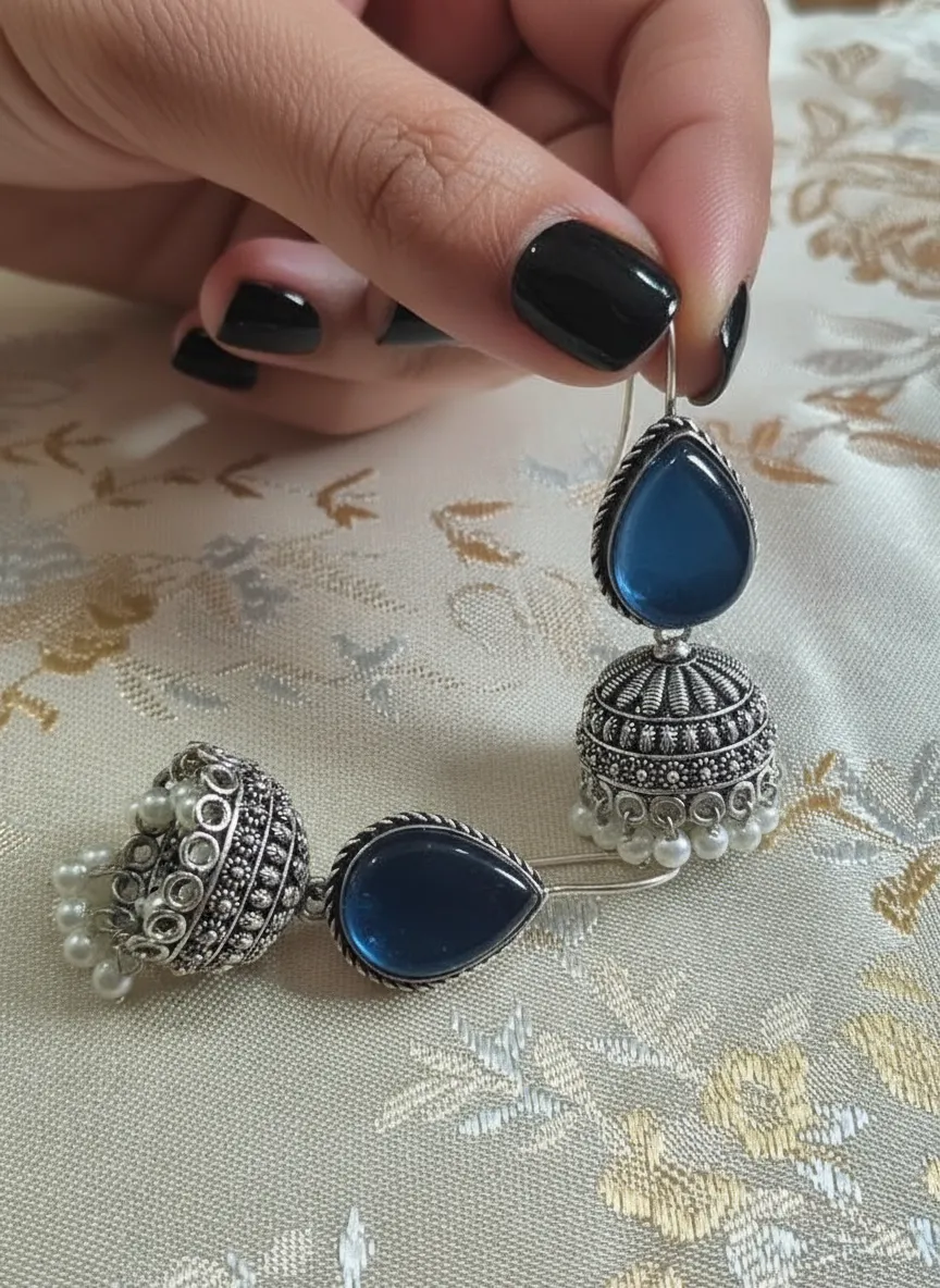 1 × Oxidized Brass Transparent Blue Stone Jhumka Earrings with Pearl Drops