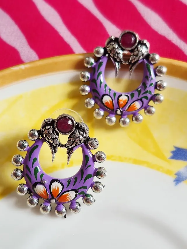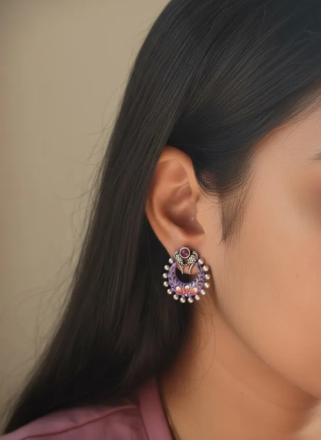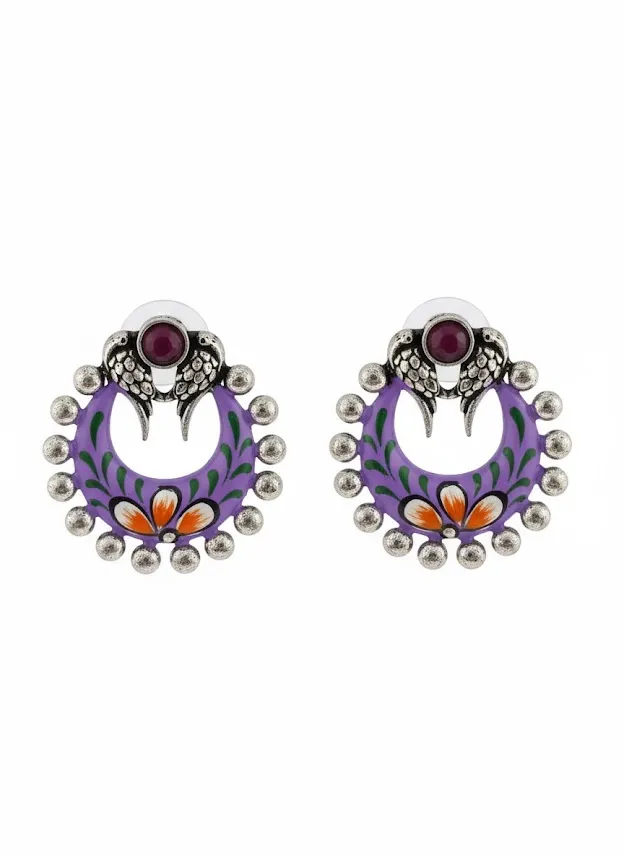 Make a bold style statement with these Handcrafted brass earrings, featuring a striking Purple enamel crescent design accented with Handpainted floral motifs and finished in an Oxidized silver tone. The top stud is detailed with a tribal-inspired motif and a Purple stone look center, giving the earrings a unique ethnic character.