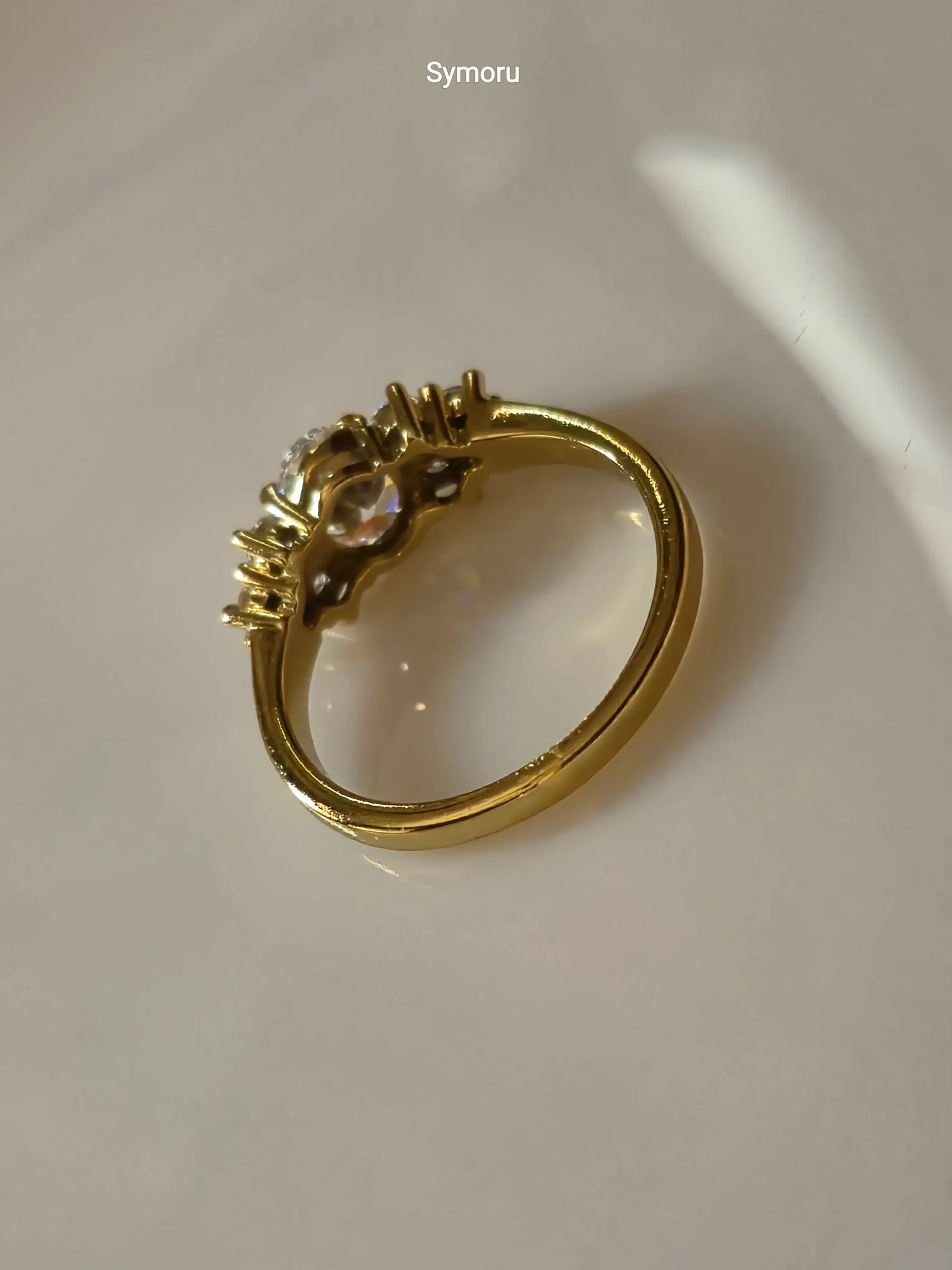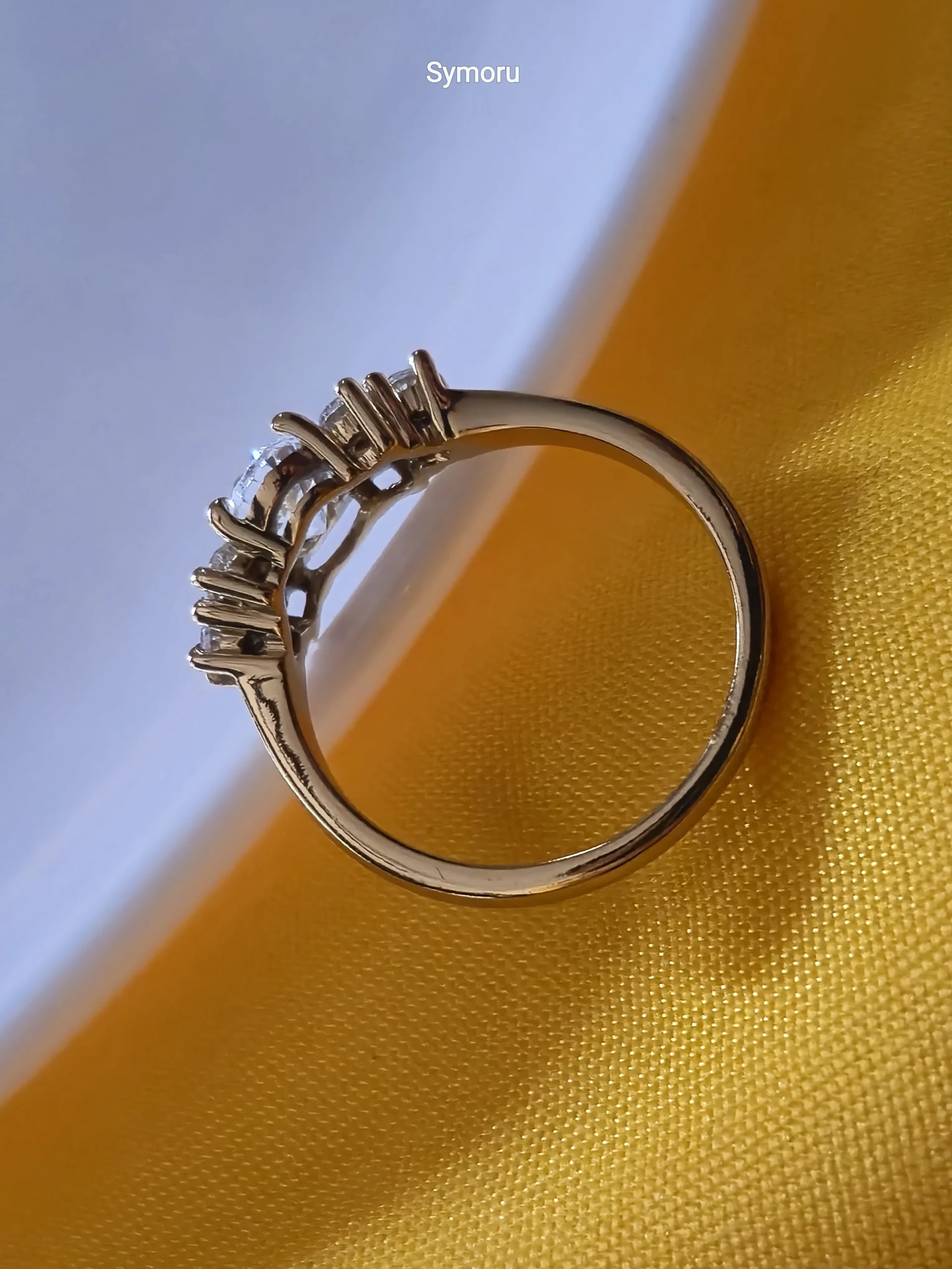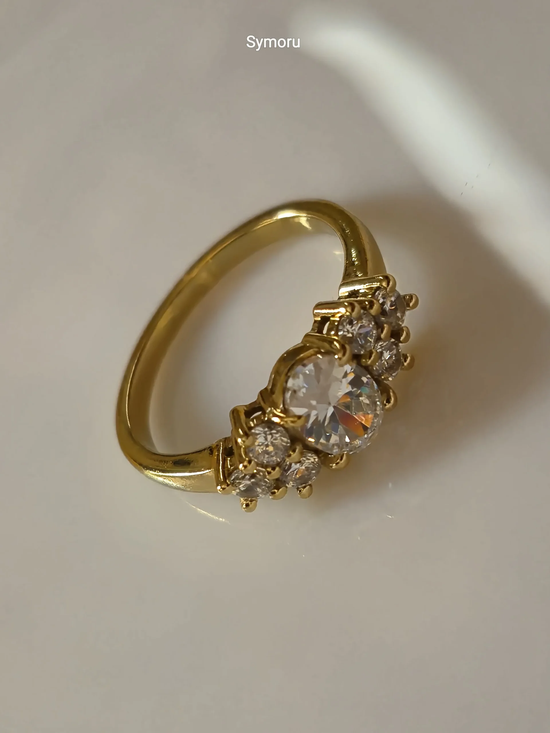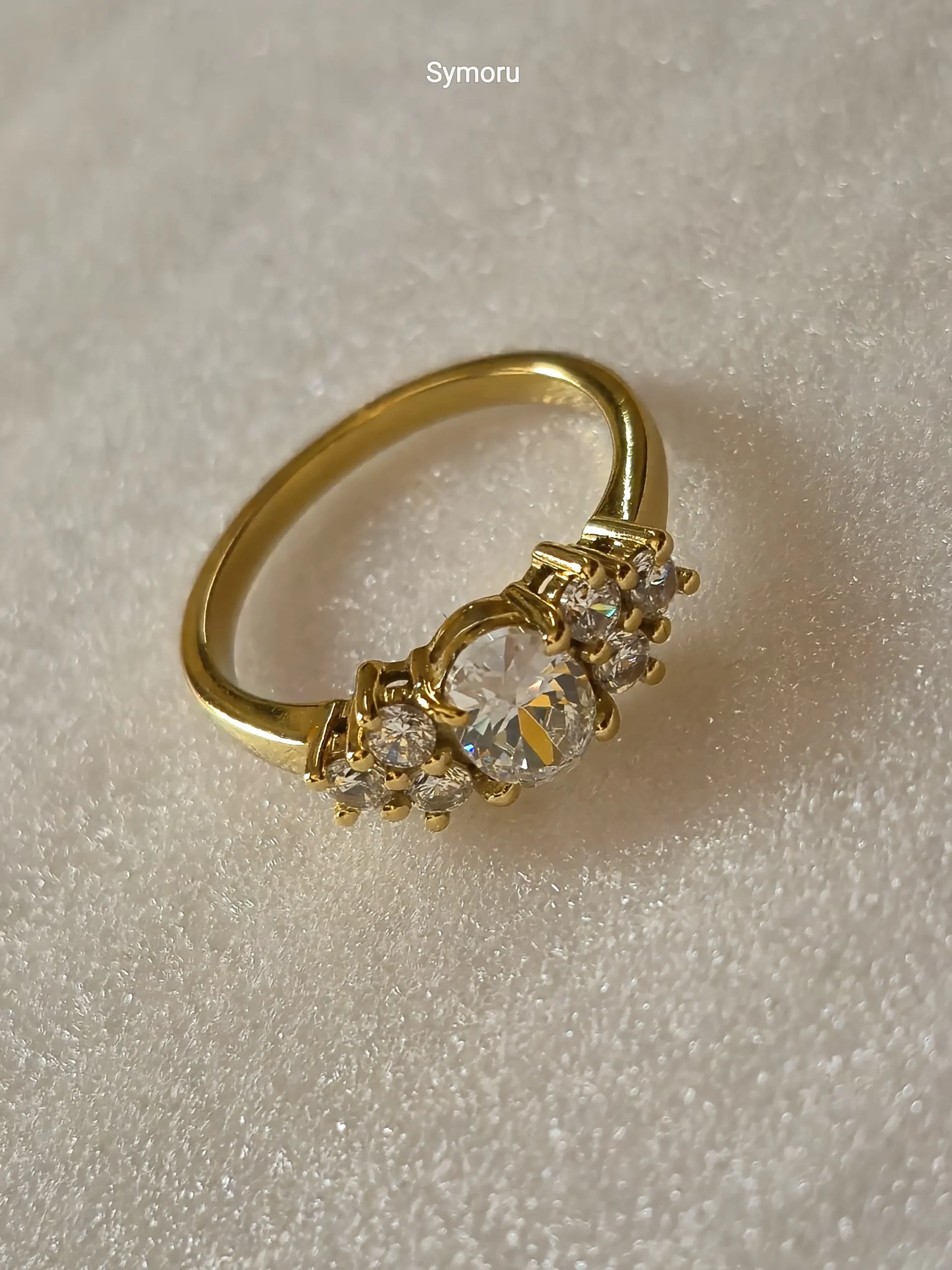 This Symoru Three-Stone Ring showcases a sparkling round-cut cubic zirconia center stone, beautifully flanked by two matching side stones. The sleek gold-plated band and precise prong setting enhance brilliance while providing a secure and luxurious look.