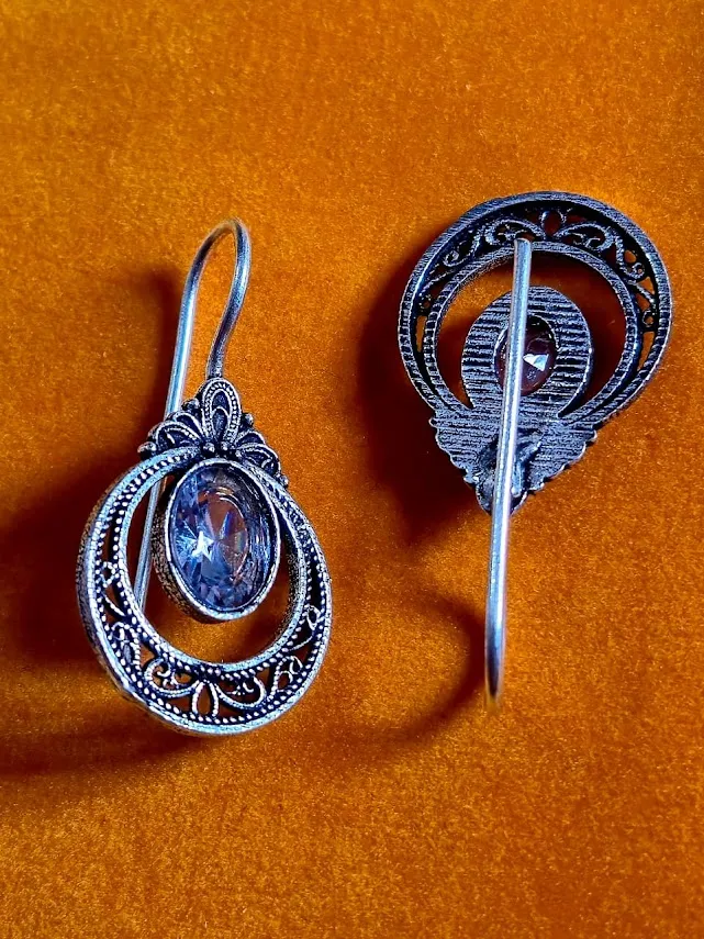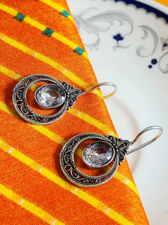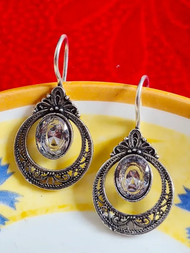Vintage Silver Look Oval Crystal Brass Dangle Earrings | Oxidized Filigree Drop Earrings for Women | Handmade Ethnic Jewelry