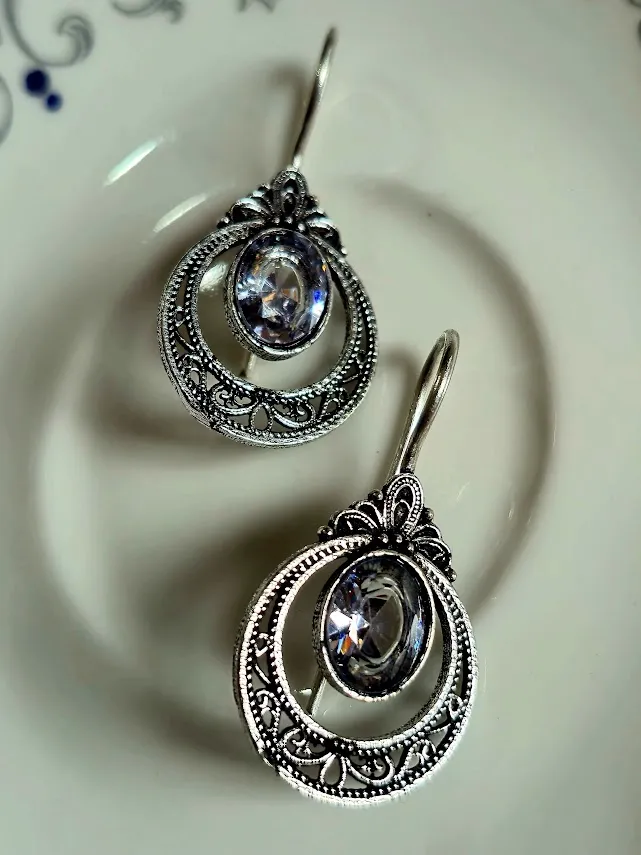 Vintage Silver Look Oval Crystal Brass Dangle Earrings